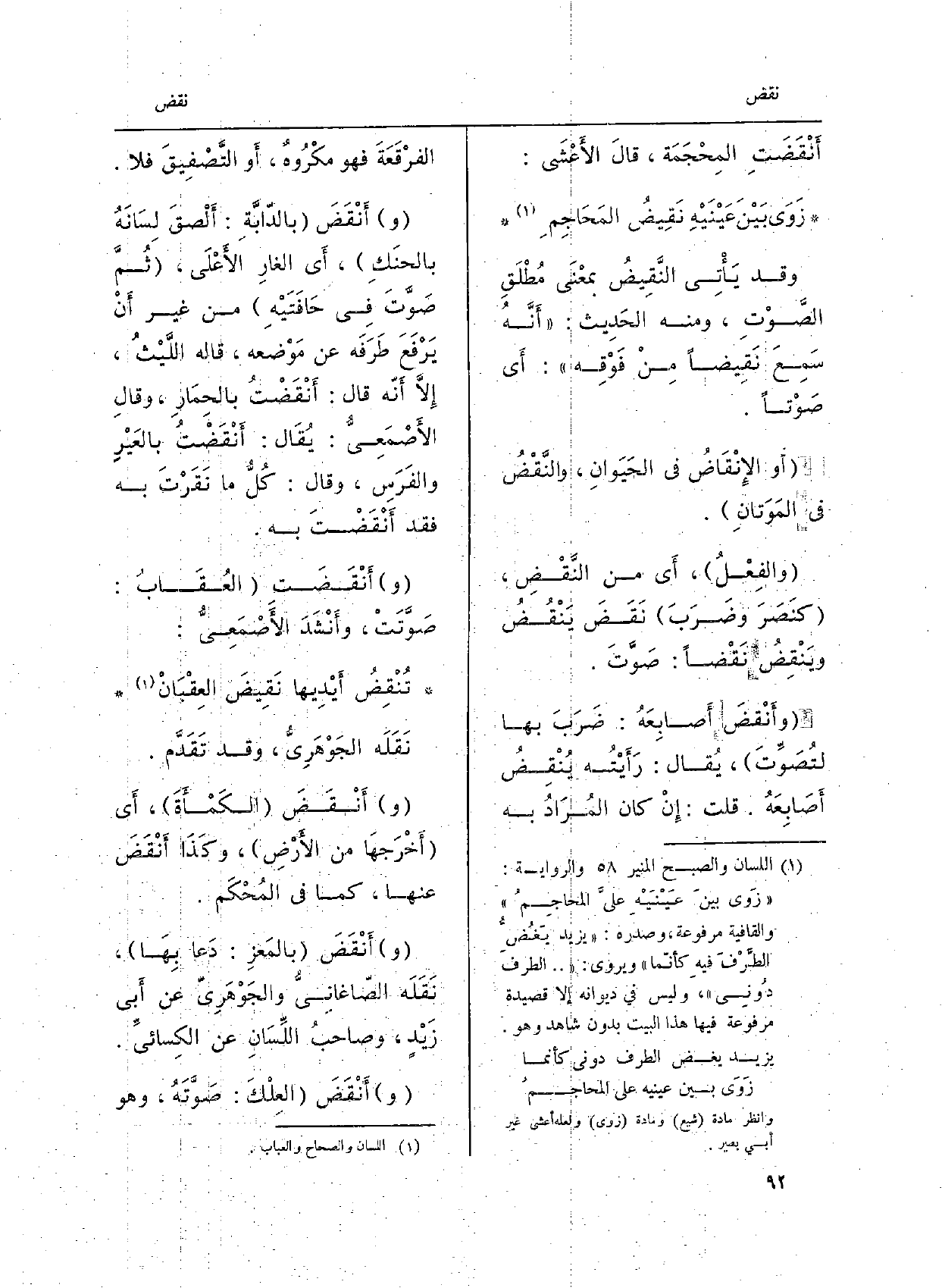 أَنْقَضَتِ المِحْجَمَة، قالَ الأَعْشَى: زَوَى بَيْنَ عَيْنَيْهِ نَقِيضُ المَحَاجِمِ وَقَدْ يَأْتِي النَّقيضُ بمَعْنَى مُطْلَقِ الصَّوْتِ، ومِنْهُ الحَديث: أَنَّهُ سَمْعَ نَقِيضاً مِنْ فَوْقِه أَي: صَوْتاً. أَو الإِنْقاضُ فِي الحَيَوانِ، والنَّقْضُ فِي المَوَتانِ. والفعلُ، أَي من النَّقْضِ، كنَصَرَ وضربَ نَقَضَ يَنْقُضُ ويَنْقِضُ نَقْضاً: صَوَّتَ. وأَنْقَضَ أَصابِعَهُ: ضَرَبَ بهَا لتُصَوِّتَ، يُقَالُ: رَأَيْتُه يُنْقِضُ أَصابِعَهُ. قُلْتُ: إِنْ كانَ المُرادُ بِهِ الفرْقَعَةَ فَهُوَ مَكْروهٌ، أَو التَّصْفيقَ فَلَا. وأَنْقَضَ بالدَّابَّةِ: أَلْصَقَ لِسانَهُ بالحنَكِ، أَي الغارِ الأَعْلى، ثمَّ صوَّتَ فِي حافتَيْهِ من غيرِ أَن يرفَعَ طَرَفَه عَن مَوْضعه، قالَه اللَّيْثُ، إلاَّ أَنَّهُ قالَ: أَنْقَضْتُ بالحِمارِ، وَقَالَ الأَصْمَعِيّ: يُقَالُ: أَنْقَضْتُ بالعَيْرِ والفَرَسِ، وَقَالَ: كلُّ مَا نَقَرْتَ بِهِ فَقَدْ أَنْقَضْتَ بِهِ. وأَنْقَضَتِ العُقابُ: صوَّتَتْ، وأَنْشَدَ الأَصْمَعِيّ: تُنْقِضُ أَيْدِيها نَقيضَ العِقْبانْ نَقَلَهُ الجَوْهَرِيّ، وَقَدْ تَقَدَّم. وأَنْقَضَ الكَمْأَةَ، أَي أَخْرَجها من الأَرْضِ، وَكَذَا أَنْقَضَ عَنْهَا، كَمَا فِي المُحْكَمِ. وأَنْقَضَ بالمَعزِ: دَعا بهَا، نَقَلَهُ الصَّاغَانِيُّ والجَوْهَرِيّ عَن أَبي زَيْدٍ، وَصَاحب اللّسَان عَن الكِسَائِيّ. وأَنْقَضَ العِلْكَ: صَوَّتَهُ، وَهُوَ