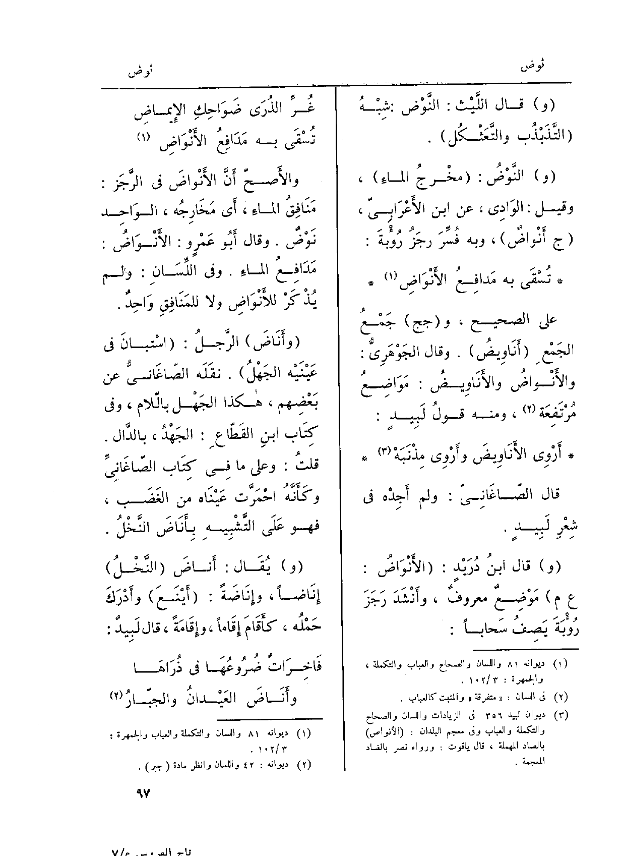 وقالَ اللَّيْثُ: النَّوْضُ: شِبْهُ التَّذَبْذُب والتَّعَثْكُل. والنَّوْضُ: مخْرجُ الماءِ، وَقيل: الْوَادي، عَن ابْن الأَعْرَابيّ، وَالْجمع {أَنْواضٌ، وَبِه فُسِّرَ رجَزُ رُؤْبَةَ: تُسْقَى بِهِ مَدافِعُ} الأَنْواضِ عَلَى الصَّحِيح، وجمعُ الجمعِ {أَناويضُ. وَقَالَ الجَوْهَرِيّ: والأَنْواضُ} والأَنَاويضُ: مواضِعٌ) مُرتفعَةٌ، ومِنْهُ قَوْلُ لبيدٍ: أَرْوِي {الأَناويضَ وأَرْوي مِذْنَبَهْ قالَ الصَّاغَانِيُّ: وَلم أَجِدْه فِي شِعْرِ لَبيدٍ. وَقَالَ ابْن دُرَيْدٍ: الأَنْواضُ: موضعٌ معروفٌ، وأَنْشَدَ رَجَزَ رُؤْبَةَ يَصِفُ سَحاباً: غُرُّ الذرَى ضَوَاحِكِ الإِيماضِ تُسْقَى بِهِ مَدَافِعُ الأَنْواضِ والأَصَحّ أَنَّ الأَنْواضَ فِي الرَّجَز: مَنافِقُ الماءِ، أَي مَخَارِجُه، الواحِد نَوْضٌ. وَقَالَ أَبو عَمْرو: الأَنْواضُ: مَدَافِعُ الماءِ. وَفِي اللّسَان: وَلم يُذكرْ} للأَنْواضِ وَلَا للمَنَافِقِ واحِدٌ. {وأَنَاضَ الرَّجُلُ: اسْتبان فِي عَيْنَيْه الجَهْلُ. نَقَلَهُ الصَّاغَانِيُّ عَن بعضِهم، هَكَذا الجَهْل بالَّلام، وَفِي كِتاب ابنِ القَطَّاع: الجَهْدُ، بالدَّال. قُلْتُ: وعَلى مَا فِي كِتاب الصَّاغَانِيُّ وكأَنَّه احْمَرَّتْ عَيْناه من الغَضَبِ، فَهُوَ عَلَى التَّشْبيهِ} بأَنَاضَ النَّخْلُ. ويُقَالُ: {أَنَاضَ النَّخْلُ} إِناضاً،! وإِناضَةً: أَيْنَعَ وأَدْرَكَ حمْلُه، كأَقامَ إِقاماً، وإِقامَةً، قالَ لَبيدٌ: