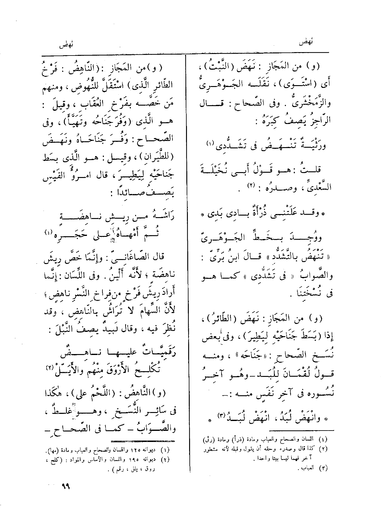 وَمن المَجَازِ: نَهَضَ النَّبْتُ، أَي اسْتَوَى، نَقَلَهُ الجَوْهَرِيّ والزَّمَخْشَرِيُّ. وَفِي الصّحاح: قالَ الرَّاجِزُ يَصِفُ كِبَرَهُ: ورَثْيَةٌ تَنْهَضُ فِي تَشَدُّدِي قُلْتُ: هُوَ قَوْلُ أَبو نُخَيْلَةَ السَّعْدِيِّ، وصَدرُه: وَقَدْ عَلَتْنِي ذُرْأَةٌ بادِي بَدِي ووُجِدَ بخَطِّ الجَوْهَرِيّ: تَنْهَضُ بالتَّشَدُّدِ. قالَ ابنُ بَرِّيّ: والصَّوَابُ فِي تَشَدُّدي كَمَا هُوَ فِي نُسخَتِنا. وَمن المَجَازِ: نَهَضَ الطَّائِرُ، إِذا بَسَطَ جَنَاحَيْهِ ليَطيرَ، وَفِي بعض نُسَخ الصّحاح: جَنَاحَه، ومِنْهُ قَوْلُ لُقْمانَ لِلُبَد وَهُوَ آخِرُ نُسُوره فِي آخِر نَفَسٍ مِنْهُ: وانْهَضْ لُبَدُ، انْهَضْ لُبَدُ. وَمن المَجَازِ: النَّاهِضُ: فَرْخُ الطَّائِر الَّذي اسْتَقَلَّ للنُّهُوضِ، وَمِنْهُم مَن خصَّه بفَرْخِ العُقابِ، وقيلَ: هُوَ الَّذي وَفُرَ جَنَاحُه وتَهَيَّأَ، وَفِي الصّحاح: وَفُرَ جَنَاحَاهُ ونَهَضَ للطَّيَرانِ، وَقيل: هُوَ الَّذي بسَط جَناحَيْهِ ليَطيرَ، قالَ امرُؤُ القَيْسِ يَصِفُ صائِداً: