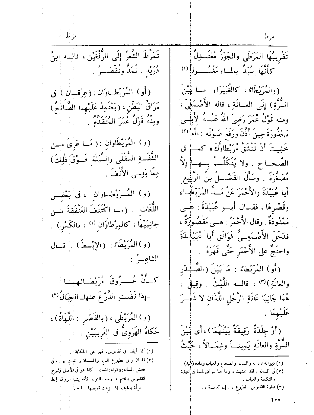 والمُرَيْطاءُ، كالغُبَيْرَاءِ: مَا بَيْنَ السُّرَّةِ إِلى العانَةِ، قَالَ الأَصْمَعِيّ، وَمِنْه قَوْلُ عُمَرَ رَضِيَ اللهُ عَنْهُ لأَبِي مَحْذُورَةَ حِينَ أَذَّنَ ورَفَعَ صَوْتَه. أَما خَشِيتَ أَنْ تَنْشَقَّ مُرَيْطاؤُك كَمَا فِي الصّحاحِ. وَلَا يُتَكَلَّمُ بِها إِلاَّ مُصَغَّرَةً. وسَأَلَ الفَضْلُ بنُ الرَّبِيعِ أَبا عُبَيْدَةَ والأَحْمَرَ عَنْ مَدِّ المُرَيْطَاءِ وقَصْرِهَا، فَقَالَ أَبو عُبَيْدَة: هِيَ مَمْدُودَةٌ. وَقَالَ الأَحْمَرُ: هِيَ مَقْصُورَةٌ، فدَخَلَ الأَصْمَعِيُّ فَوَافَق أَبا عُبَيْدَةَ واحتَجَّ على الأَحْمَرِ حَتَّى قَهَرَهُ. والمُرَيْطاءُ: مَا بَيْنَ الصَّدْرِ والعانَةِ، قَالَه اللَّيْثُ. وقِيلَ: هُمَا جَانِبَا عَانَةِ الرَّجُلِ اللَّذَانِ لَا شَعرَ عَلَيْهِمَا. أَوْ جِلْدَةٌ رَقِيقَةٌ بَيْنُهمَا، أَي بَيْنَ السُّرَّةِ والعانَةِ يَمِيناً وشِمَالاً، حَيْثُ تَمَرَّطَ الشَّعرُ إِلى الرُّفْغَيْن، قَالَه ابنُ دُرَيْدٍ. تُمَدُّ وتُقْصَرُ. أَو المُرَيْطاوَان: عِرْقانِ فِي مَرَاقِّ البَطْنِ، يَعْتَمِدُ عَلَيْهِما الصَّائحُ ومِنْهُ قَوْلُ عُمَرَ المُتَقَدِّمُ. والمُرَيْطَاوانِ: مَا عَرِيَ من الشَّفَةِ السُّفْلَى والسَّبَلَةِ فَوْقَ ذلِكَ مِمّا يَلِي الأَنْفَ. والمُرَيْطاوانِ، فِي بَعْضِ اللُّغاتِ. مَا اكْتَنَفَ العَنْفَقَةَ من جانِبَيْهَا، كالمِرْطاوَانِ، بالكَسْرِ. والمُرَيْطَاءُ: الإِبْطُ. قَالَ الشاعِرُ: