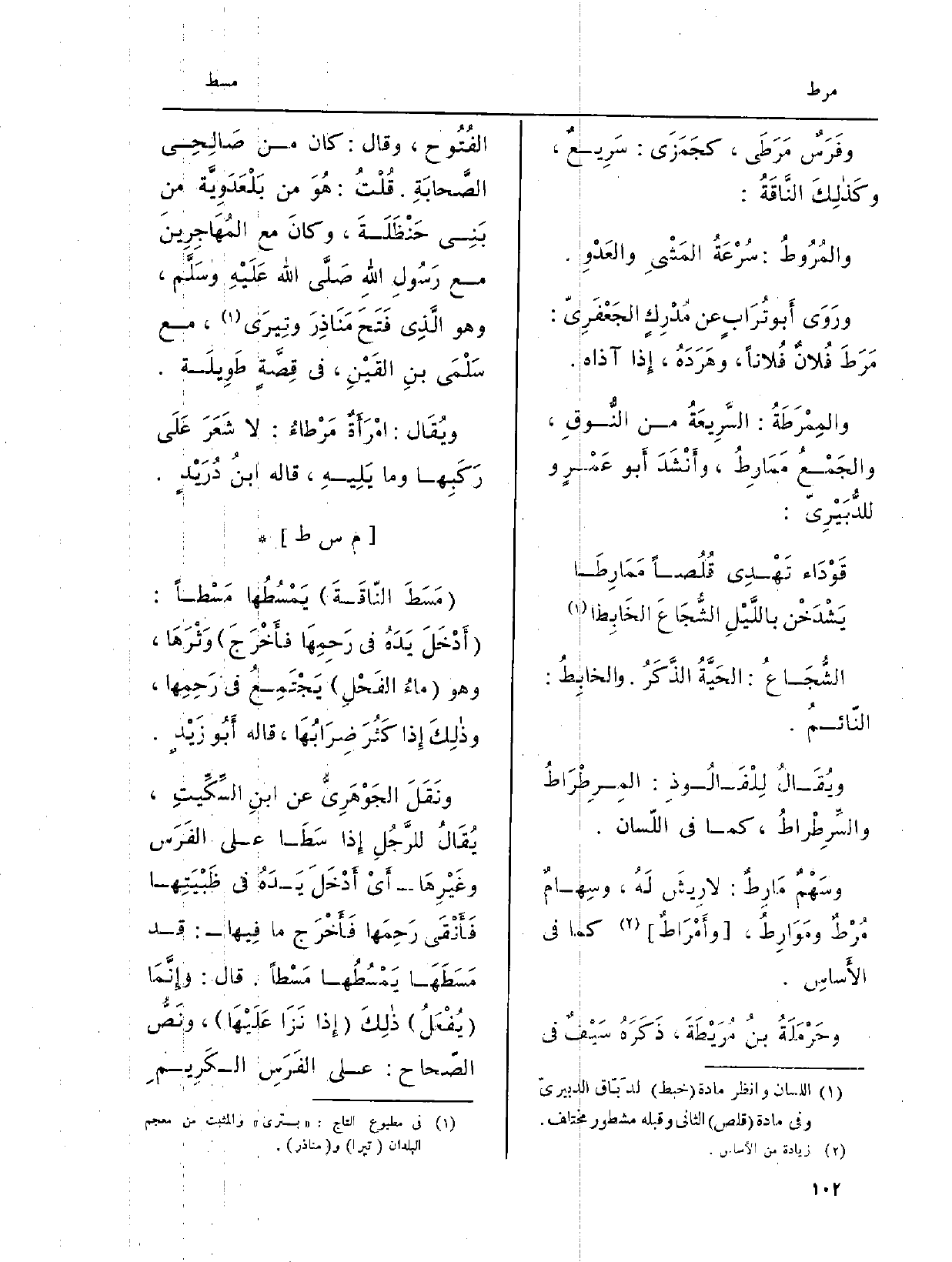 وسَهْمٌ مَارِطٌ: لَا رِيشَ لَهُ، وسِهامٌ مُرْطٌ ومَوَارِيطُ، وأَمْرَاطٌ كَمَا فِي الأَساسِ. وحَرْمَلَةُ بنُ مُرَيْطَةَ، ذَكَرَهُ سَيْفٌ فِي الفُتُوح، وَقَالَ: كَانَ من صَالِحِي الصَّحابَةِ. قُلْتُ: هُوَ من بَلْعَدَوِيَّة من بَنِي حَنْظَلَةَ، وكانَ مَعَ المُهَاجِرِينَ مَعَ رَسُولِ اللهِ صَلَّى الله عَلَيْهِ وسَلَّم، وَهُوَ الَّذِي فَتَحَ مَنَاذِرَ وتِيرَى، مَعَ سَلْمَى بنِ القَيْنِ، فِي قِصَّةٍ طَوِيلَة. ويُقَال: امْرَأَةٌ مَرْطاءُ: لَا شَعَرَ عَلَى رَكَبِها وَمَا يَلِيهِ، قَالَ ابنُ دُرَيْدٍ.