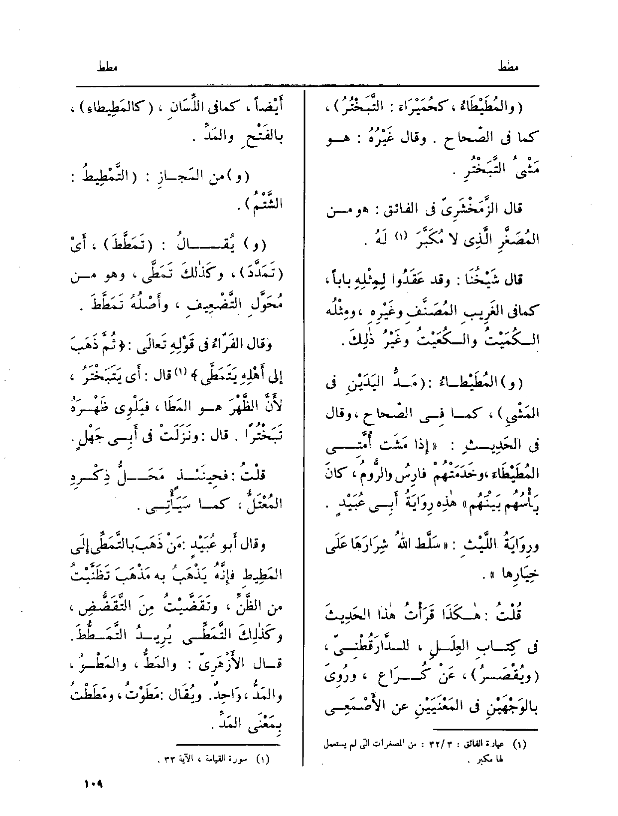 وَقَالَ الفَرّاءُ فِي قَوْلِهِ تَعالَى: ثُمَّ ذَهَبَ إِلى أَهْلِهِ يَتَمَطَّى قَالَ: أَي يَتَبَخْتَرُ، لأَنَّ الظَّهْرَ هُوَ المَطَا، فيَلْوِي ظَهْرُهُ تَبَخْتُراً. قَالَ: ونَزَلَتْ فِي أَبِي جَهْلٍ. قلْتُ: فحِينَئذٍ مَحَلُّ ذِكْرِهِ المُعْتَلُّ، كَمَا سَيَأْتِي.
