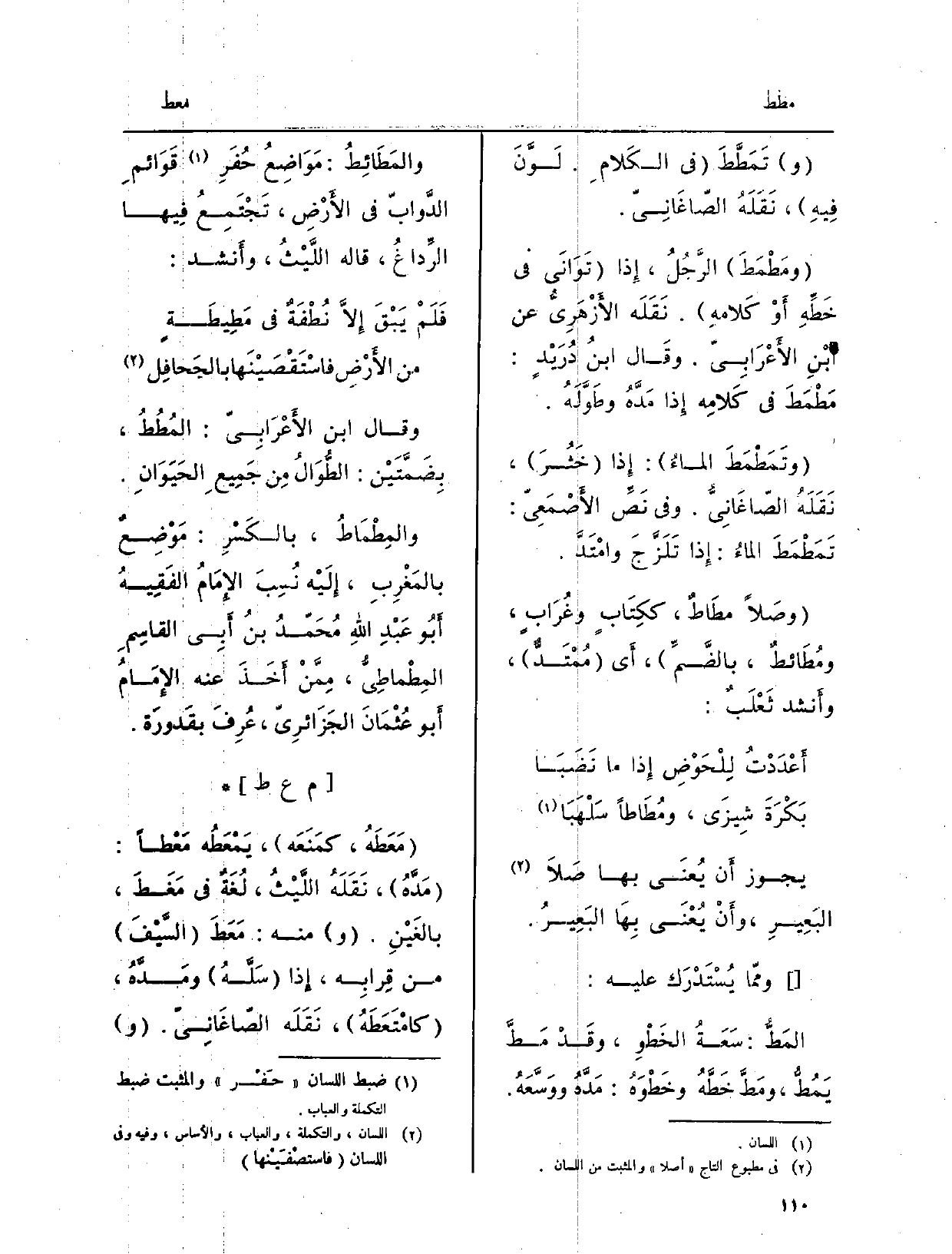 يجوز أَن يُعنَى بهَا صَلا البَعِيرِ، وأَنْ يُعْنَى بِهَا البَعِير. ومِمّا يُسْتَدْرَكُ عَليه: {المَطُّ: سَعَةُ الخَطْوِ، وقَدْ} مَطَّ {يَمُطُّ} ومَطَّ خَطَّهُ وخَطْوَهُ: مَدَّهُ ووَسَّعَهُ. {والمَطَائِطُ: مَوَاضِعُ حُفَرِ قَوَائمِ الدَّوابّ فِي الأَرْضِ، تَجْتَمِعُ فِيها الرِّداغُ، قَالَه اللَّيْثُ: وأَنشد:
