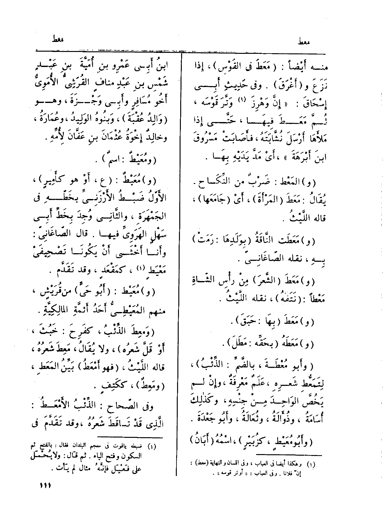 ومَعَطَهُ بحَقِّه: مَطَلَ. وأَبو مُعْطَةَ، بالضَّمِّ: الذِّئْبُ، لِتَمَعُّطِ شَعرِهِ، عَلَمٌ مَعْرِفَةٌ، وإِنْ لم يَخُصَّ الوَاحِدَ مِنْ جِنْسِهِ، وكَذلِكَ أُسَامَةُ، وذُؤَالَةُ، وثُعَالَةُ، وأَبُو جَعْدَةَ. وأَبُو مُعَيْطٍ، كزُبَيْرٍ، اسْمُهُ أَبَانُ ابنُ أَبِي عَمْرِو بنِ أُمَيَّةَ بنِ عَبْدِ شَمْسِ بنِ عَبْدِ منافٍ القُرَشِيُّ الأُمَوِيُّ أَخُو مُسَافِرٍ وأَبِي وَجْزَةَ، وَهُوَ وَالِدُ عُقْبَةَ، وَبنُوهُ الوَلِيدُ، وعُمَارَةُ، وخالِدٌ إِخْوَةُ عُثْمَانَ بنِ عَفَّانَ لأُمِّهِ. ومُعَيْطٌ: اسمٌ.