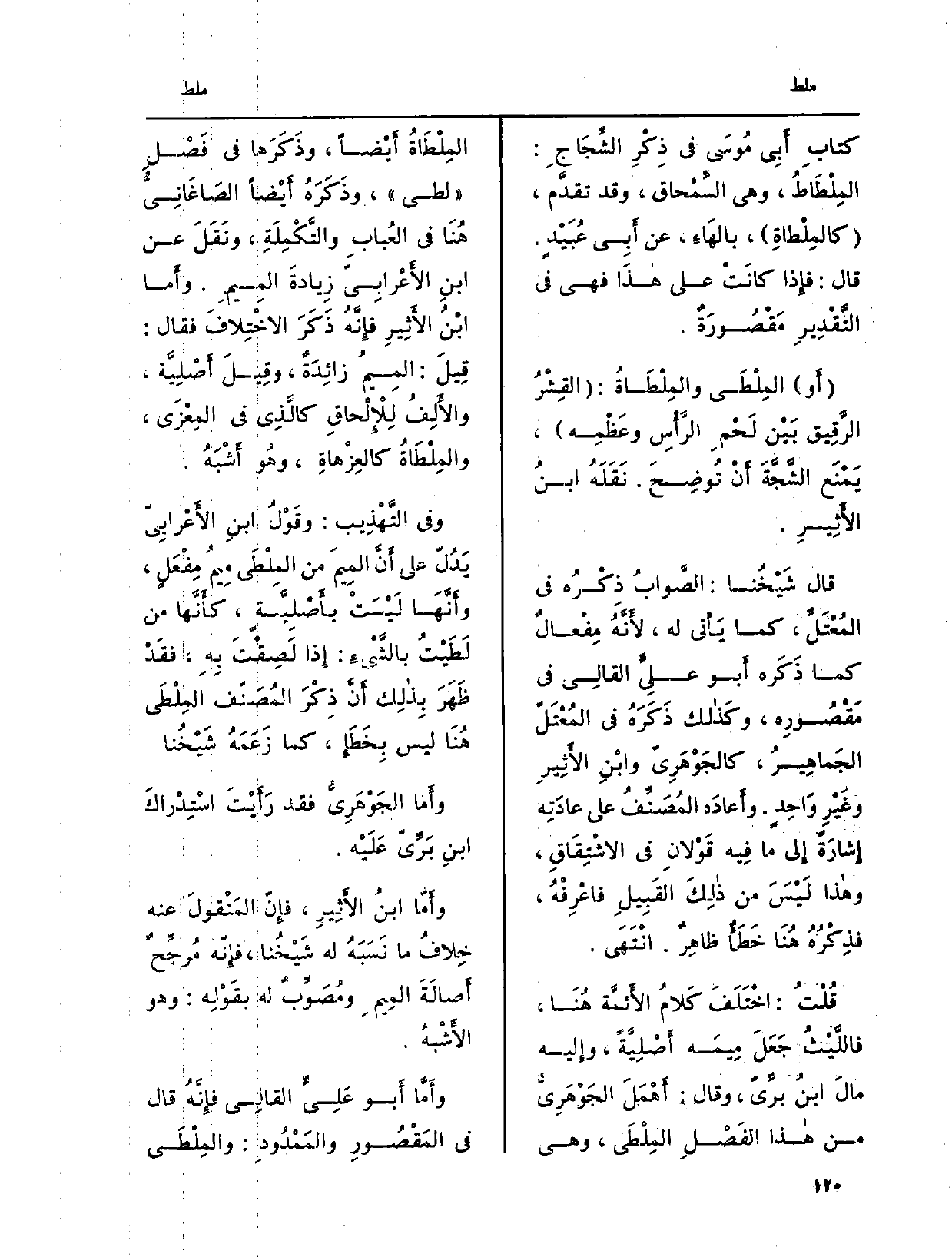 وأَمّا ابنُ الأَثِيرِ، فإِنّ المَنْقولَ عَنهُ خِلافُ مَا نَسَبَهُ لَهُ شَيْخُنا، فإِنّه مُرجِّحٌ أَصالَةَ المِيمِ ومُصَوِّبٌ لَهُ بقَوْلِه: وَهُوَ الأَشْبهُ. وأَمَّا أَبو عَلِيٍّ القالِي فإِنَّهُ قَالَ فِي المَقْصُورِ والمَمْدُودِ: المِلْطَى