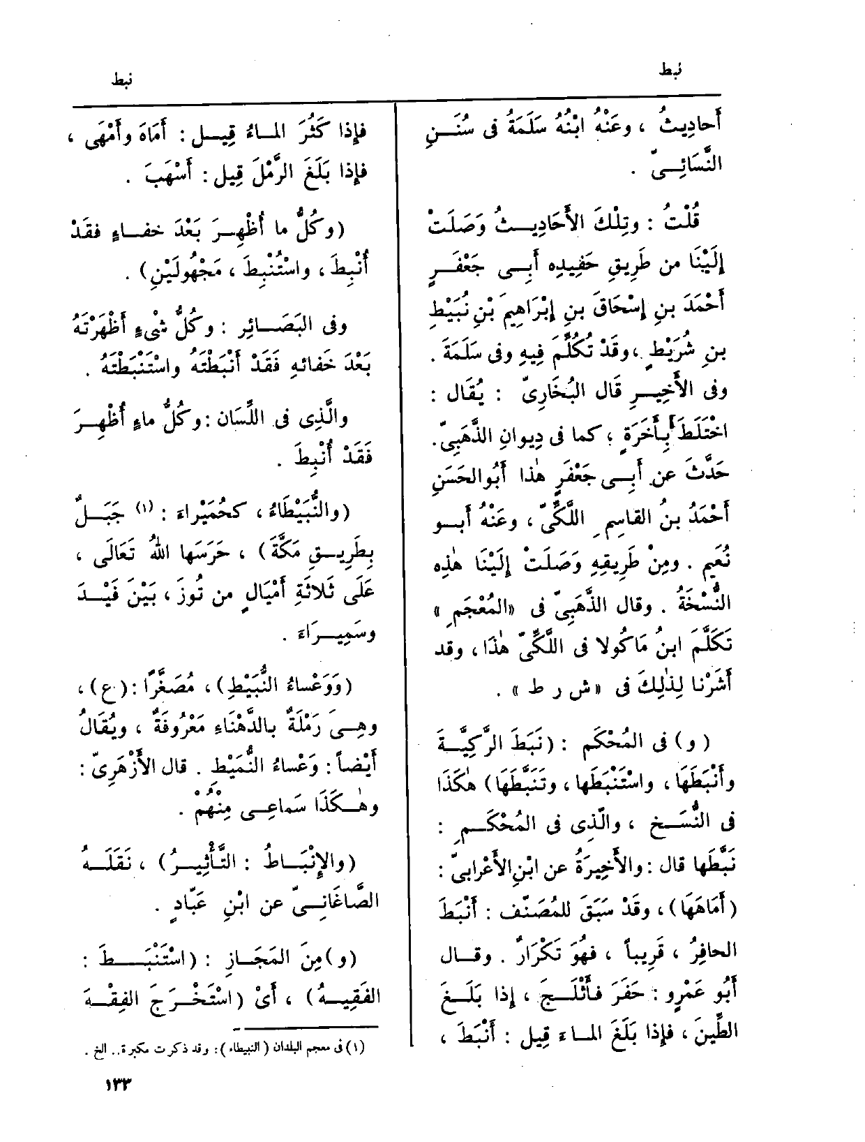 وَفِي الأَخِيرِ قَال البُخَارِيّ: يُقَال: اخْتَلَطَ بِأَخَرَةٍ، كَمَا فِي دِيوانِ الذَّهَبِيّ. حَدَّثَ عَن أَبِي جَعْفَرٍ هَذَا أَبُو الحَسَنِ أَحْمَدُ بنُ القاسِمِ اللَّكِّيّ، وعَنْهُ أَبو نُعَيم. ومِنْ طَرِيقِهِ وَصَلَتْ إِلَيْنَا هذِه النُّسْخَةُ. وَقَالَ الذَّهَبِيّ فِي المُعْجَمِ تَكَلَّمَ ابنُ مَاكُولا فِي الَّلكِّيّ هذَا، وَقد أَشَرْنا لِذلِكَ فِي ش ر ط. وَفِي المُحْكَم: نَبَطَ الرَّكِيَّةَ وأَنْبَطَهَا، واسْتَنْبَطَها، وتَنَبَّطَهَا، هكَذَا فِي النُّسَخ: والّذِي فِي المُحْكَمِ: نَبَّطَها قَالَ: والأَخِيرَةُ عَن ابْنِ الأَعْرَابيّ: أَمَاهَهَا، وقَدْ سَبَقَ للمُصَنّف: أَنْبَطَ الحافِرُ، قَرِيباً، فهُوَ تَكْرَارٌ. وَقَالَ أَبُو عَمْرٍ و: حَفَرَ فأَثْلَجَ، إِذا بَلَغَ الطِّينَ، فإِذا بَلَغَ الماءَ قِيل: أَنْبَطَ، فإِذا كَثُرَ الماءُ قِيل: أمَاهَ وأمْهَى، فإِذا بَلَغَ الرَّمْلَ قِيل: أَسْهَبَ. وكُلُّ مَا أُظْهِرَ بَعْدَ خفاءٍ فقَدْ أُنْبِطَ، واسْتُنْبِطَ، مَجْهُولَيْنِ. وَفِي البَصَائِر: وكُلُّ شْيءٍ أَظْهَرْتَهُ بَعْدَ خَفائهِ فَقَدْ أَنْبَطْتُه واسْتَنْبَطْتَهُ.