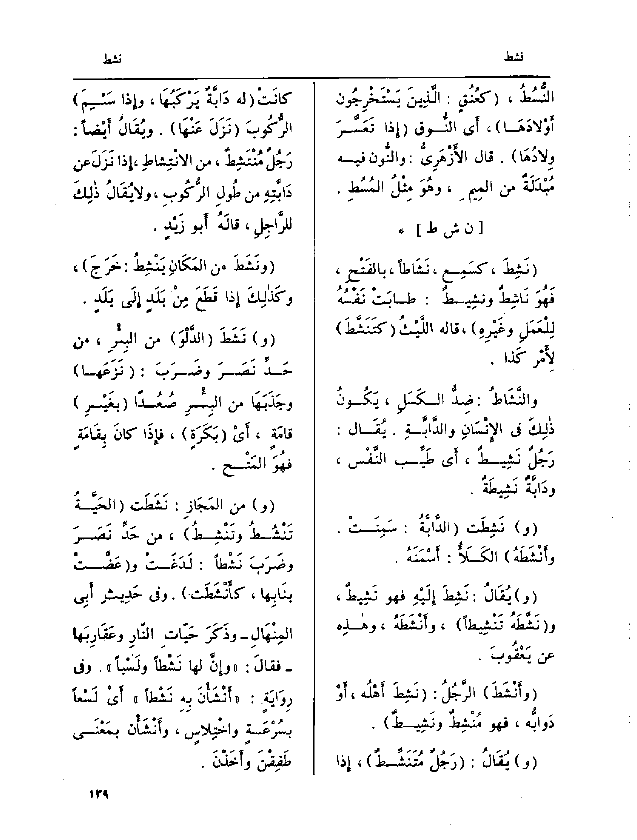وأَنْشَطَ الرَّجُلُ: نَشِطَ أَهْلُه، أَوْ دَوابُّه، فَهُوَ مُنْشِطٌ ونَشِيطٌ.