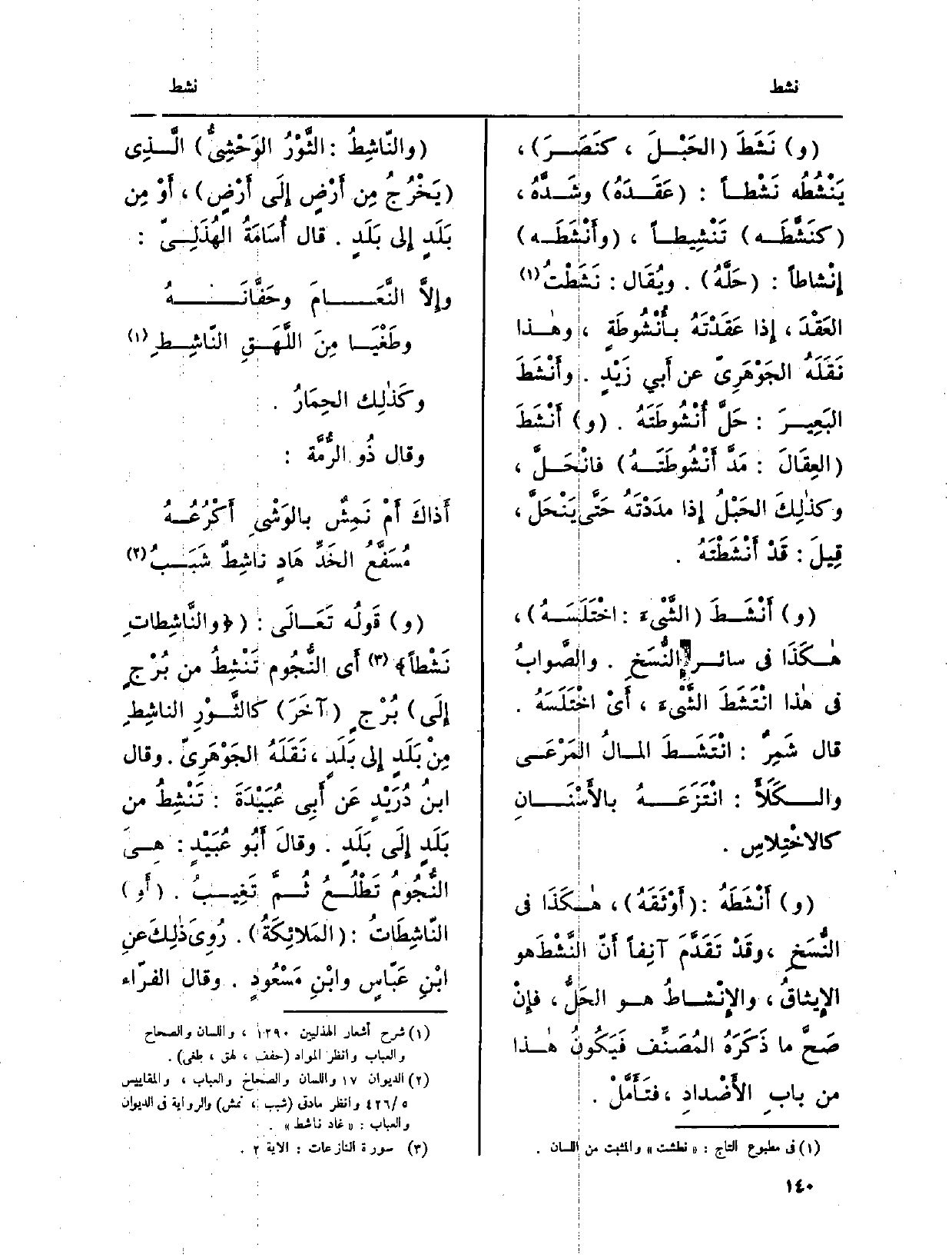 وقَولُه تَعَالَى: والنَّاشِطاتِ نَشْطاً أَي النُّجُوم تَنْشِطُ من بُرْجٍ إِلَى بُرْجٍ آخَرَ كالثَّوْرِ الناشِطِ مِنْ بَلَدٍ إِلَى بَلَدٍ، نَقَلهُ الجَوْهَرِيّ. وَقَالَ ابنُ دُرَيْدٍ عَن أَبِي عُبَيْدَةَ: تَنْشِطُ من بَلَدَ إِلَى بَلَدٍ. وقالَ أَبُو عُبَيْدٍ: هِيَ النُّجُومُ تَطْلُعُ ثُمَّ تَغِيبُ. أَو النّاشِطَاتُ: المَلائِكَةُ. رُوِيَ ذلِكَ عَنِ ابْنِ عَبّاسٍ وابْنِ مَسْعُودٍ. وَقَالَ الفرّاء