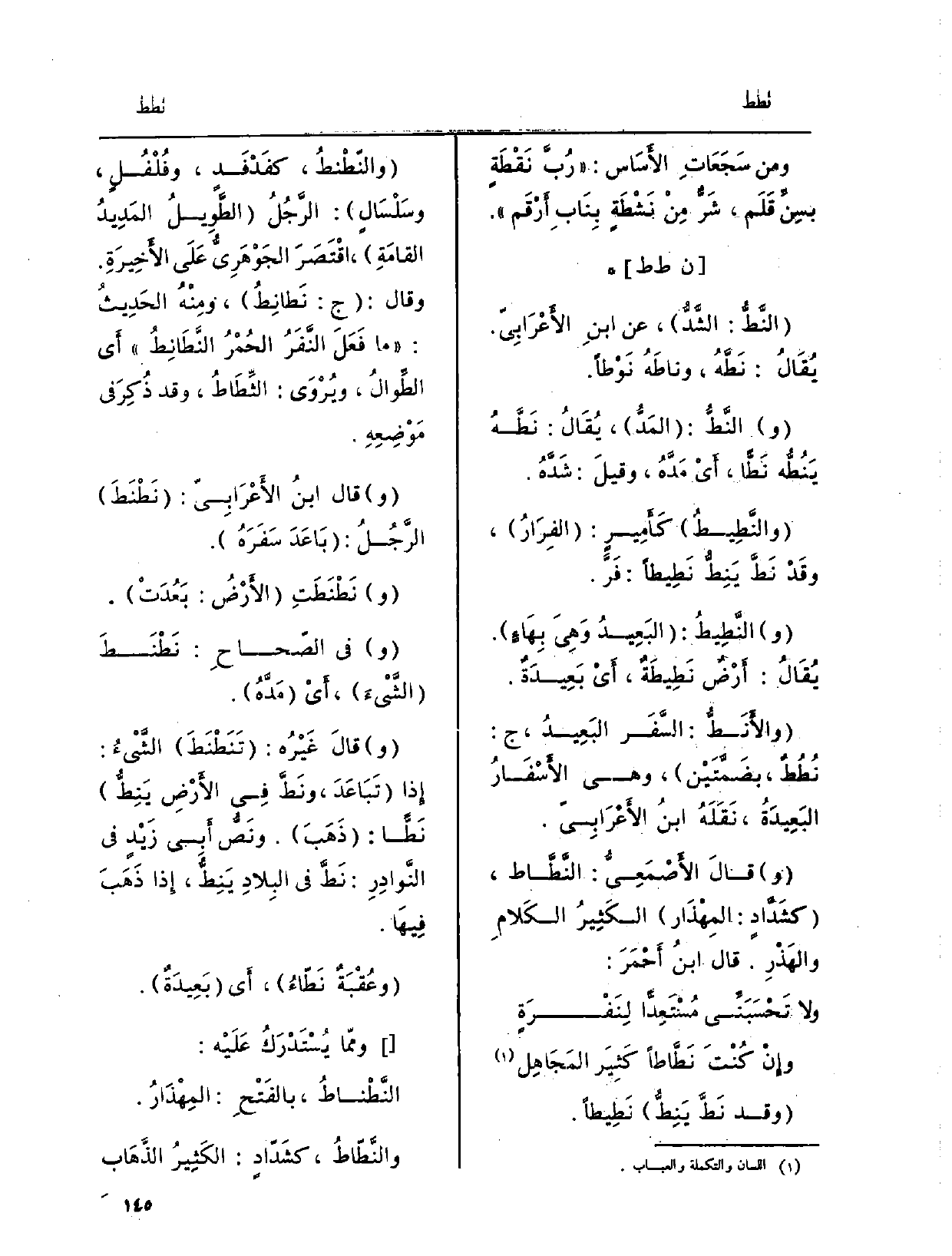 {النَّطُّ: الشَّدُّ، عَن ابْنِ الأَعْرَابِيّ. يُقَالُ:} نَطَّهُ، وناطَهُ نَوْطاً. والنَّطُّ: المَدُّ، يُقَالُ: نَطَّهُ يَنُطُّه نَطّاً، أَي مَدَّهُ، وقيلَ: شَدَّهُ. {والنَّطِيطُ كَأَمِيرٍ: الفِرَارُ، وقَدْ} نَطَّ {يَنِطُّ} نَطِيطاً: فَرَّ. (و) {النَّطِيطُ: البَعِيدُ وَهِيَ بِهَاءٍ. يُقَالُ: أَرْضٌ} نَطِيطَةٌ، أَيْ بَعِيدَةٌ. {والأَنَطُّ: السَّفَر البَعِيدُ، ج:} نُطُطٌ، بضَمَّتَيْن، وَهِي الأَسْفَارُ البَعِيدَةُ، نَقَلهُ ابْن الأَعْرَابِيّ. وقالَ الأَصْمَعِيُّ: النَّطَّاط، كشَدَّادٍ: المِهْذَار الكَثِيرُ الكَلامِ والهَذْرِ. قَالَ ابنُ أَحْمَرَ: