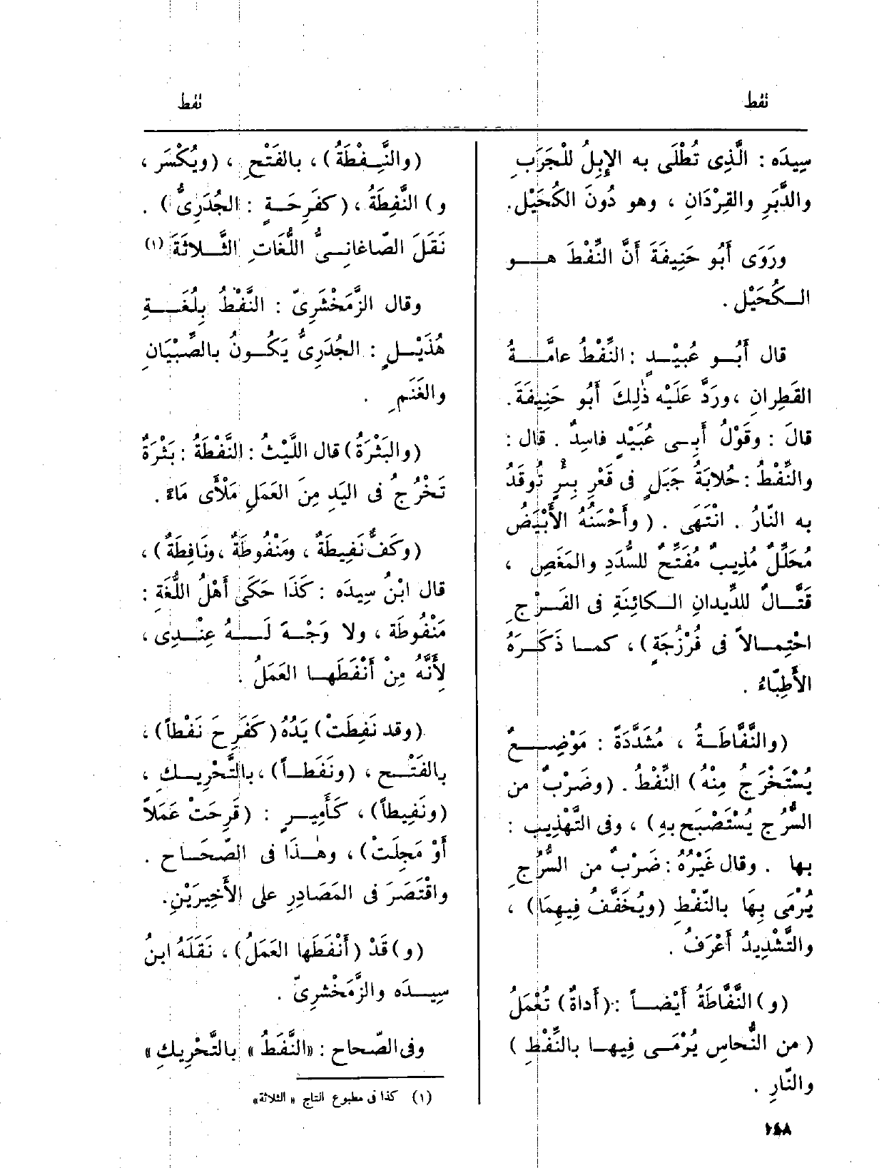 قَالَ أَبُو عُبَيْدٍ: النِّفْطُ عامَّةُ القَطِرانِ، ورَدَّ عَلَيْه ذلِكَ أَبُو حَنِيفَةَ. قالَ: وقَوْلُ أَبِي عُبَيْدٍ فاسِدٌ. قَالَ: والنِّفْطُ: حُلابَةُ جَبَلٍ فِي قَعْرِ بِئْرٍ تُوقَدُ بِهِ النّارُ. انْتَهَى. وأَحْسَنُهُ الأَبْيَضُ مُحَلِّلٌ مُذِيبٌ مُفَتَّحٌ للسُّدَدِ والمَغصِ، قَتَّالٌ للدِّيدانِ الكائِنَةِ فِي الفَرْجِ احْتِمالاً فِي فُرْزَجَةٍ، كَمَا ذَكَرهُ الأَطِبّاءُ.