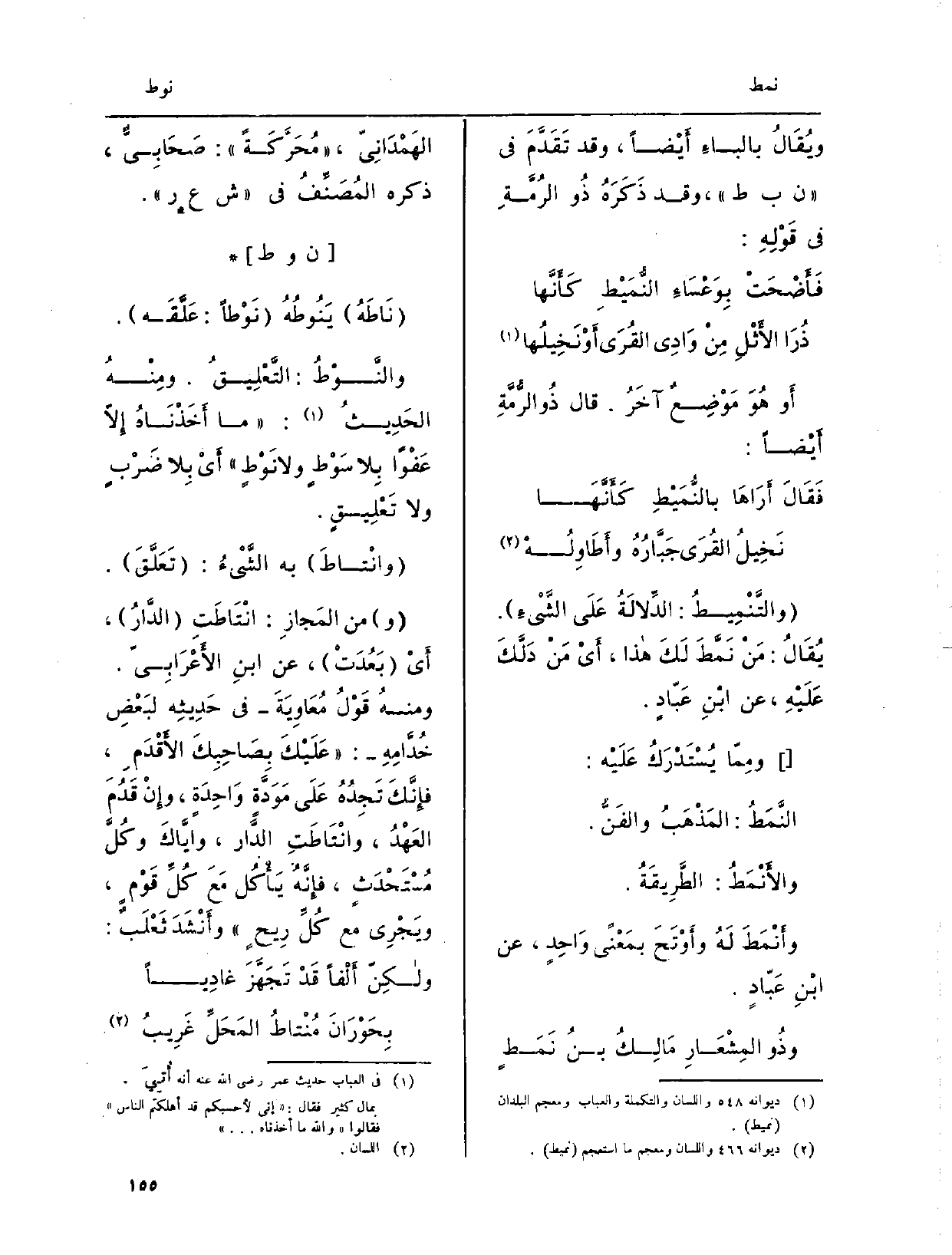 وَمن المَجازِ: {انْتَاطَتِ الدَّارُ، أَيْ بَعُدَتْ، عَن ابنِ الأَعْرَابِيّ. ومنهُ قَوْلُ مُعَاوِيَةَ فِي حَدِيثِه لبَعْضِ خُدَّامِهِ: عَلَيْكَ بِصَاحِبِكَ الأَقْدَمِ، فإِنَّكَ تَجِدُهُ عَلَى مَوَدَّةٍ وَاحِدَةٍ، وإِنْ قَدُمَ العَهْدُ،} وانْتَاطَتِ الدَّار، وايَّاكَ وكُلَّ مُسْتَحْدَثٍ، فإِنَّهُ يَأْكُل مَعَ كُلِّ قَوْمٍ، ويَجْرِي مَعَ كُلِّ رِيحٍ وأَنْشَدَ ثَعْلَبٌ: