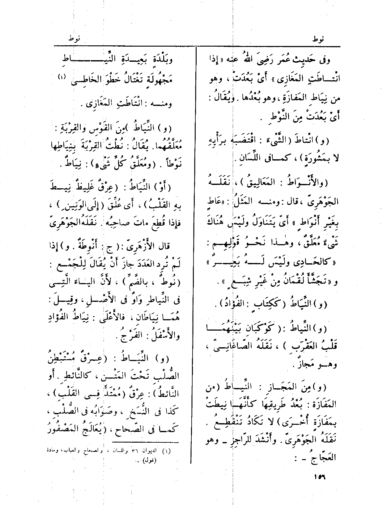 وَفِي حَدِيث عُمَر رَضِيَ اللهُ عَنهُ: إِذا {انْتاطِتِ المَغَازِي أَيْ بَعُدَت وَهُوَ من} نِيَاط الْمَفَازَة هُوَ بعْدهَا وَيُقَال: أَي بَعدت مِنَ {النَّوْطِ.