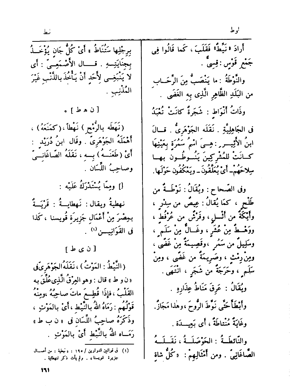 أَرادَ {نَيِّطٌ فَقَلَبُ، كَما قَالُوا فِي جَمْعِ قَوْسٍ: قِسِيٌّ.} والنَّوْطَةُ: مَا يَنْصَبُ مِنَ الرِّحَابِ من البَلَدِ الظَّاهِرِ الَّذِي بِهِ الغَضَى. وذَاتُ {أَنْوَاطٍ: شَجَرةٌ كانَتْ تُعْبَدُ فِي الجَاهِلِيَّةِ. نَقَلَه الجَوْهَرِيُّ. قالَ ابنُ الأَثِيرِ: هِيَ اسْمُ سَمُرَةٍ بِعَيْنِهَا كانَتْ للمُشْرِكِينَ} يَنُوطُون بهَا سِلاحَهُمْ أَيْ يُعَلِّقُونَ ويَعْكُفُون حَوْلَها. وَفِي الصّحاح: ويُقَالُ: {نَوْطَةٌ من طَلْحٍ، كمَا يُقالُ: عِيصٌ من سِدْرٍ، وأَيْكَةٌ من أَثْلٍ، وفَرْشٌ من عُرْفُطٍ، ووَهَطٌ مِنْ عُشَرٍ، وغَالٌّ مِنْ سَلَمٍ، وسَلِيلٌ من سَمُرٍ، وقَصِيمَةٌ مِنْ غَضىً، ومِنْ رِمْثٍ، وصَرِيمَةٌ من غَضىً، ومِنْ سَلَمٍ، وحَرَجَةٌ من شَجَرٍ، انْتَهَى.