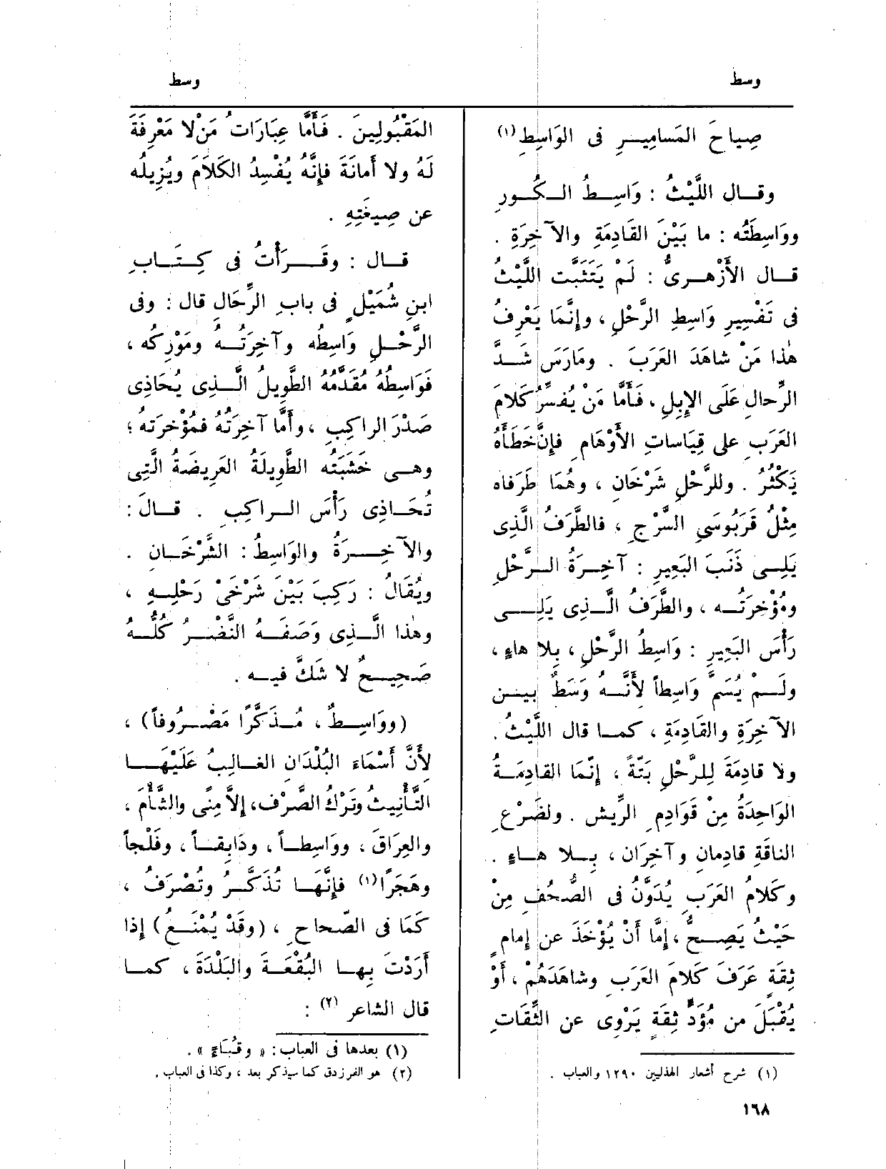 وشاهَدَهُمْ، أَوْ يُقْبَلَ من مُؤَدٍّ ثِقَةٍ يَرْوِي عَن الثِّقَاتِ المَقْبُولِينَ. فأَمَّا عِبَارَاتُ مَنْ لَا مَعْرِفَةَ لَهُ وَلَا أَمانَةَ فإِنَّهُ يُفْسِدُ الكَلاَمَ ويُزِيلُه عَن صِيغَتِهِ. قَالَ: وقَرَأْتُ فِي كِتَابِ ابنِ شُمَيْلٍ فِي بابِ الرِّحَالِ قَالَ: وَفِي الرَّحْلِ} وَاسِطُه وآخِرَتُهُ ومَوْرِكُه، فَوَاسِطُهُ مُقَدَّمُهُ الطَّوِيلُ الَّذِي يُحَاذِي صَدْرَ الراكِبِ، وأَمَّا آخِرتُهُ فمُؤْخرَتُه، وَهِي خَشَبَتُه الطَّوِيلَةُ العَرِيضَةُ الَّتِي تُحَاذِي رَأْسَ الراكِبِ. قالَ: والآخِرَةُ {والوَاسِطُ: الشَّرْخَانِ. ويُقَالُ: رَكِبَ بَيْنَ شَرْخَيْ رَحْلِهِ، وَهَذَا الَّذِي وَصَفَهُ النَّضْرُ كُلُّهُ صَحِيحٌ لَا شَكَّ فِيهِ.} ووَاسِطٌ، مُذَكَّراً مَصْرُوفاً، لأَنَّ أَسْمَاءَ البُلْدَانِ الغالِبُ عَلَيْهَا التَّأْنِيثُ وتَرْكُ الصَّرْف، إِلاَّ مِنى والشَّأْمَ، والعِرَاقَ،! ووَاسِطاً، ودَابِقاً، وفَلْجاً وهَجَراً فإِنَّهَا تُذَكَّرُ وتُصْرَفُ، كَمَا فِي الصّحاحِ.