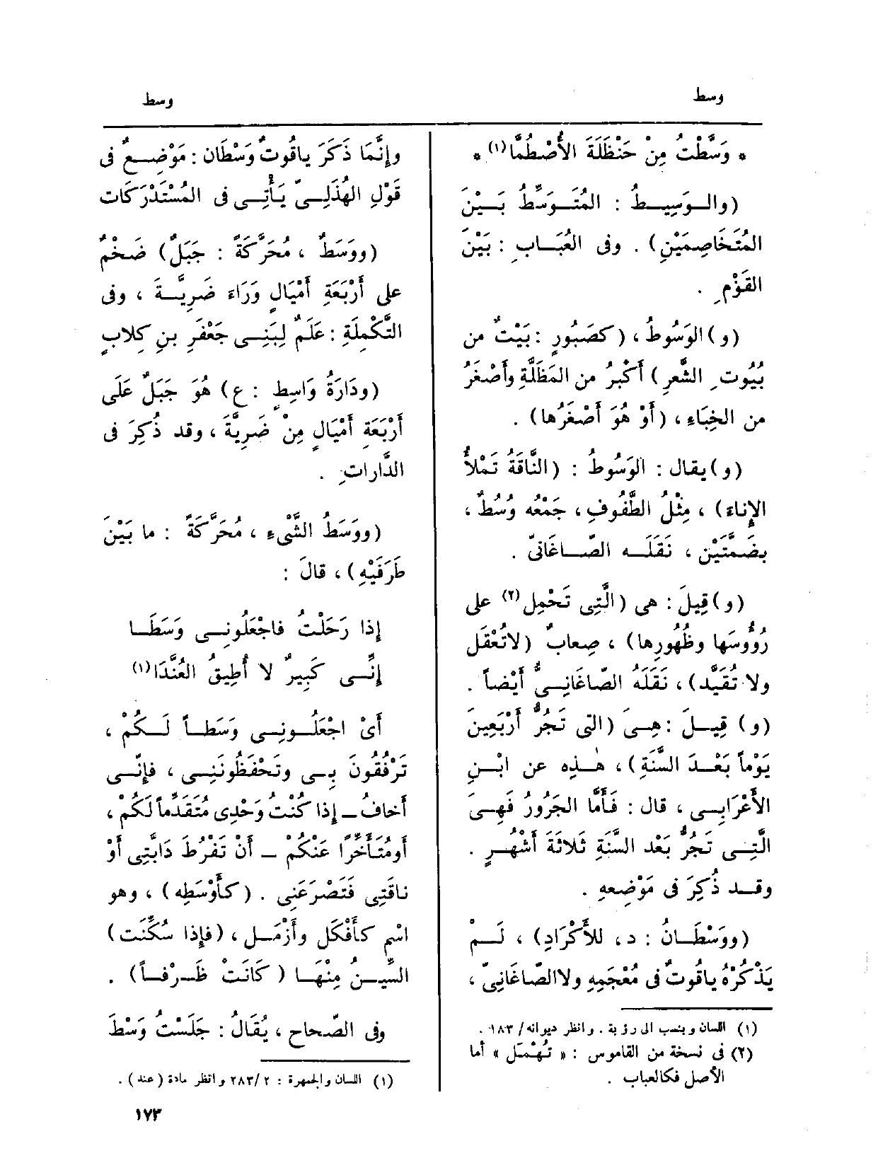 وَقد ذُكِرَ فِي مَوْضِعهِ. {ووَسْطَانُ: د، للأَكْرَادِ، لَمْ يَذْكُرْهُ ياقُوتٌ فِي مُعْجَمِهِ وَلَا الصّاغَانِيّ، وإِنَّما ذَكَرَ ياقُوتٌ} وَسْطَان: مَوْضِعٌ فِي قَوْلِ الهُذَلِيّ يَأْتِي فِي المُسْتَدْرَكَات {ووَسَطٌ، مُحَرَّكَةً: جَبَلٌ ضَخْمٌ على أَرْبَعَةِ أَمْيَالٍ وَرَاءَ ضَرِيَّةَ، وَفِي التَّكْمِلَةِ: عَلَمٌ لِبَنِي جَعْفَرِ بنِ كَلابٍ ودَارَهُ وَاسِطٍ: ابْن الأَعْرَابِيّ هُوَ جَبَلٌ عَلَى أَرْبَعَةِ أَمْيَالٍ مِنْ ضَرِيَّةَ، وَقد ذُكِرَ فِي الدَّاراتِ.