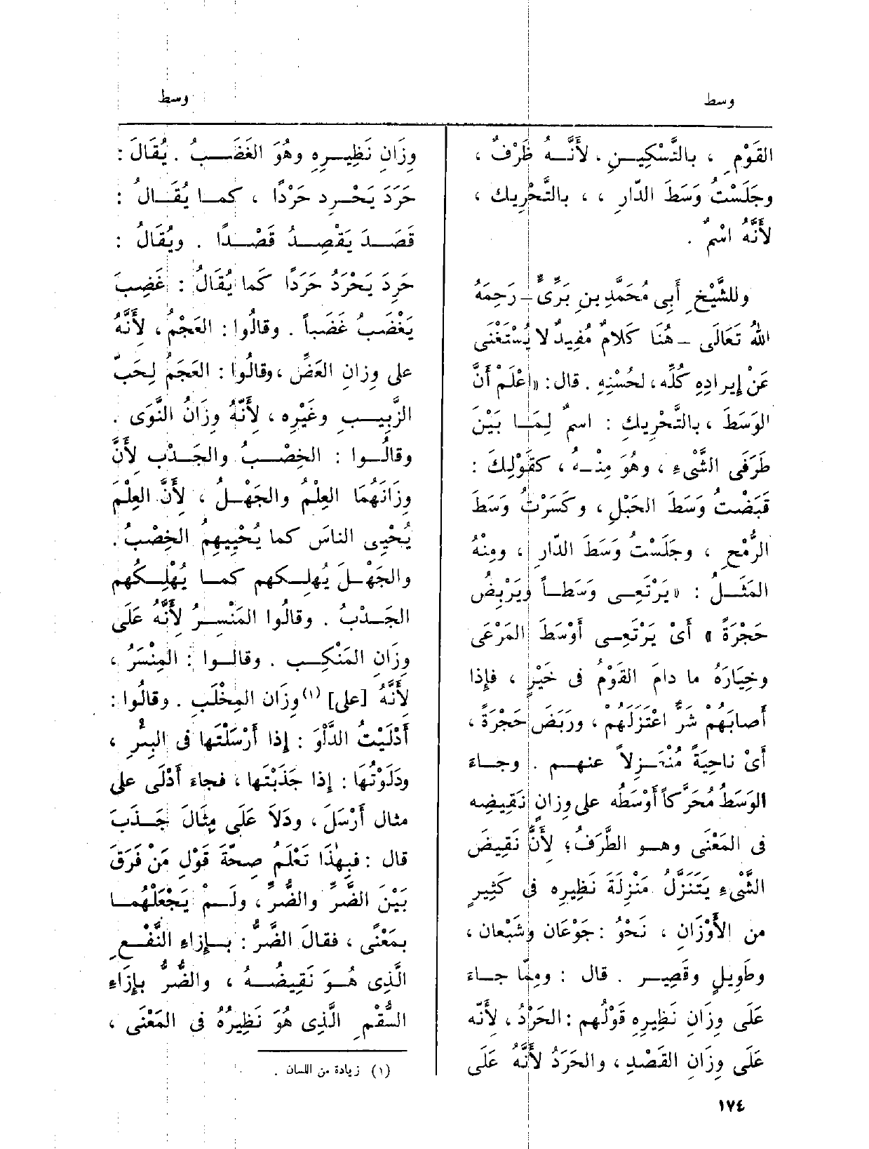 وللشَّيْخِ أَبِي مُحَمَّدِ بنِ بَرِّيٍّ رَحِمَهُ اللهُ تَعَالَى هُنَا كَلامٌ مُفِيدٌ لَا يُسْتَغْنَي عَنْ إِيرادِهِ كُلِّه، لحُسْنِهِ. قَالَ: اعْلَمْ أَنَّ الوَسَطَ، بالتَّحْرِيكِ: اسمٌ لِمَا بَيْنَ طَرَفَي الشَّيْءِ، وهُوَ مِنْهُ، كقَوْلِكَ: قَبَضْتُ وَسَطَ الحَبْلِ، وكَسَرْتُ وَسَطَ الرُّمْحِ، وجَلَسْتُ وَسَطَ الدّارِ، ومِنْهُ المَثَلُ: يَرْتَقِي وَسَطاً ويَرْبِضُ حَجْرَةً، أيْ يَرْتعِي أَوْسَطَ المَرْعَى وخِيَارَهُ مَا دامَ القَوْمُ فِي خَيْرٍ، فإِذا أَصابَهُمْ شَرٌّ اعْتَزَلَهُمْ، ورَبَضَ حَجْرَةً، أَيْ ناحِيَةً مُنْعَزِلاً عَنْهُم. وجاءَ الوَسَطُ مُحَرَّكاً! أَوْسَطُه على وِزانٍ نَقِيضِه فِي المَعْنَى وَهُوَ الطَّرَفُ، لأَنَّ نَقِيضَ الشَّيْءِ يَتَنَزَّلُ مَنْزِلَةَ نَظِيره فِي كَثِيرٍ من الأَوْزَانِ، نَحْوُ: جَوْعَان وشَبْعان، وطَوِيلٍ وقَصِير. قَالَ: ومِمّا جاءَ عَلَى وِزَانِ نَظِيرِه قَوْلُهم: الحَرْدُ، لأَنّه عَلَى وِزَانِ القَصْدِ، والحَرَدُ لأَنَّهُ عَلَى وِزَانِ نَظِيرِهِ وهُوَ الغَضَبُ. يُقَالُ: حَرَدَ يَحْرِد حَرْداً، كَمَا يُقَالُ: قَصَدَ يَقْصِدُ قَصْداً. ويُقَالُ: حَرِدَ يَحْرَدُ حَرَداً كَما يُقَالُ: غَضِبَ يَغْضَبُ غَضَباً. وقالُوا: العَجْمُ، لأَنَّهُ على وِزانِ العَضِّ، وقالُوا: العَجَمُ لِحَبّ الزَّبِيبِ وغَيْرِه، لأَنَّهُ وِزَانُ النَّوَى.