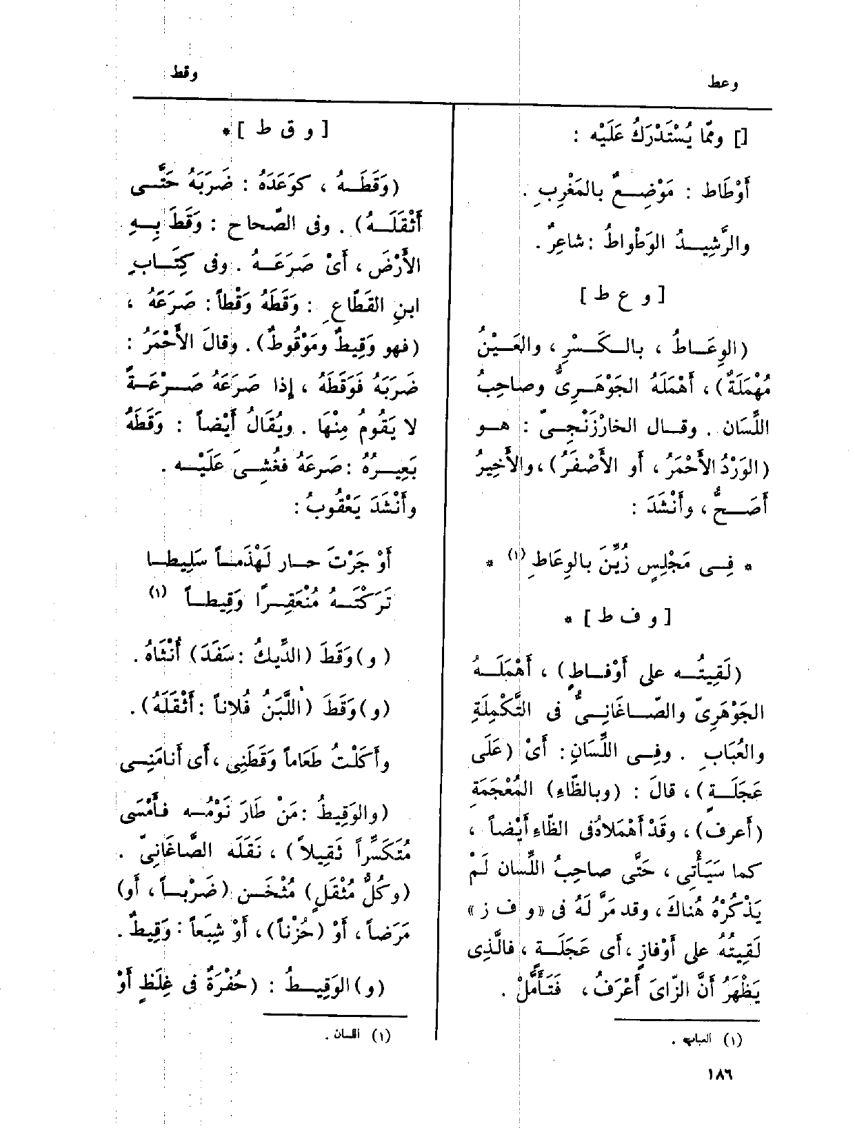 لَقِيتُه على {أَوْفاطٍ، أَهْمَلَهُ الجَوْهَرِيّ والصّاغَانِيُّ فِي التَّكْمِلَةِ والعُبَابِ. وفِي اللِّسَانِ: أَيْ عَلَى عَجَلَةٍ، قالَ: وبالظّاءِ المُعْجَمَةِ أَعرف، وقَدْ أَهْمَلاهُ فِي الظّاءِ أَيْضاً، كَمَا سَيَأْتِي، حَتَّى صاحِبُ اللِّسانُ لَمْ يَذْكُرْهُ هُناكَ، وَقد مَرَّ لَهُ فِي وف ز. لَقِيتُهُ على أوْفَازٍ، أَي عَجَلَة، فالَّذِي يَظْهَرُ أَنَّ الزّايَ أَعْرَفُ، فَتَأَمَّلْ.