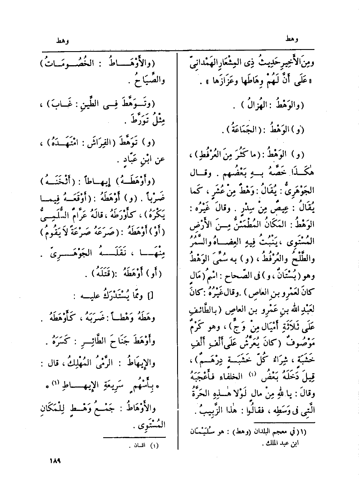 والوَهْطُ: الجَمَاعَةُ. والوَهْطُ: مَا كَثُرَ مِنَ العُرْفُطِ هكَذَا خَصَّهُ بهِ بَعْضُهم. وَقَالَ الجَوْهَرِيُّ: يُقَالُ: {وَهْطٌ مِنَ عُشَرٍ، كَما يُقَالُ: عِيصٌ مِنْ سِدْرٍ. وقالَ غَيْرُه: الوَهْطُ: المَكَانُ المُطْمَئنُّ مِنَ الأَرْضِ المُسْتَوِي، يَنْبُتُ فِيهِ العِضاةُ والسَّمُرُ والطَّلْحُ والعُرْفُطُ، وَبِه سُمِّيَ الوَهْطُ وَهُوَ بَسْتَانٌ، وَفِي الصّحاح: اسْمُ مَالٍ كانَ لعَمْرِو بنِ الْعَاصِ. وَقَالَ غَيْرُهُ: كانَ لَعَبْدِ الله بنِ عَمْرِو بن العاصِ بالطَّائفِ عَلَى ثَلاَثَةِ أَمْيَال مِنْ وَجٍّ، وَهُوَ كَرْمٌ مَوْصُوفٌ كانَ يُعَرَّشُ عَلَى أَلْفِ أَلْفِ خَشَبَةٍ، شِرَاءُ كُلّ خَشَبَةٍ دِرْهَمٌ، قِيلَ دَخَلَهُ بَعْضُ الخلفاءِ فأَعْجَبَهُ وقالَ: يَا للهِ مِنْ مالٍ لَوْلا هذِهِ الحَرَّةُ الَّتِي فِي وَسَطه، فقالُوا: هَذَا الزَّبِيبُ.} والأَوْهَاطُ: الخَصُومَاتُ والصَّيَاحُ.
