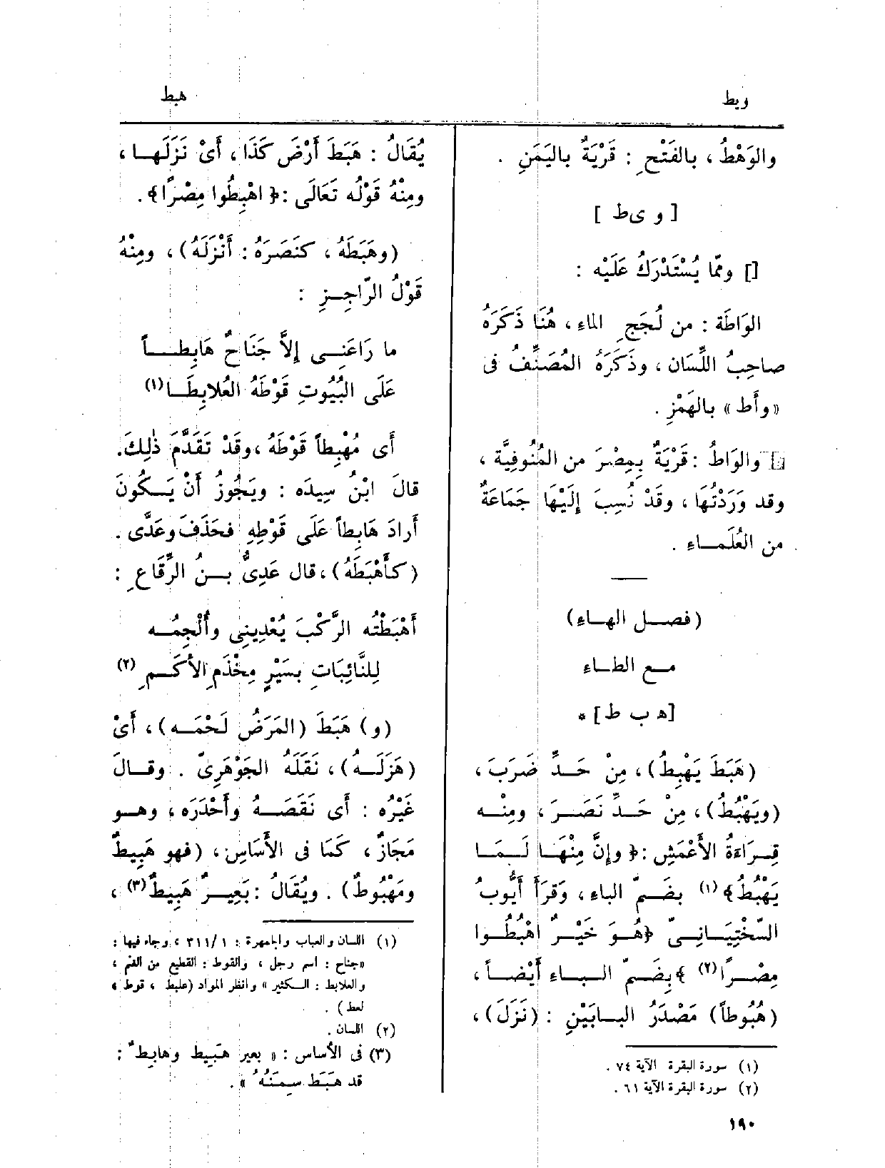 هَبَطَ يَهْبِطُ، مِنْ حَدِّ ضَرَبَ، ويَهْبُطُ، مِنْ حَدِّ نَصَرَ، ومِنْه قِرَاءَةُ الأَعْمَشِ: وإِنَّ مِنْهَا لَمَا يَهْبُطُ، بضَمّ الباءِ، وَقرأَ أَيُّوبُ السَّخْتِيَانِيّ هُوَ خَيْرٌ اهْبُطُوا مِصْراً بِضَمّ الباءِ أَيْضاً، هُبُوطاً مَصْدَرُ البابَيْنِ: نَزَلَ. يُقَالُ: هَبَطَ أَرْضَ كَذَا، أَيْ نَزَلهَا، ومِنْهُ قَوْلُه تَعَالَى: اهْبِطُوا مِصْراً.