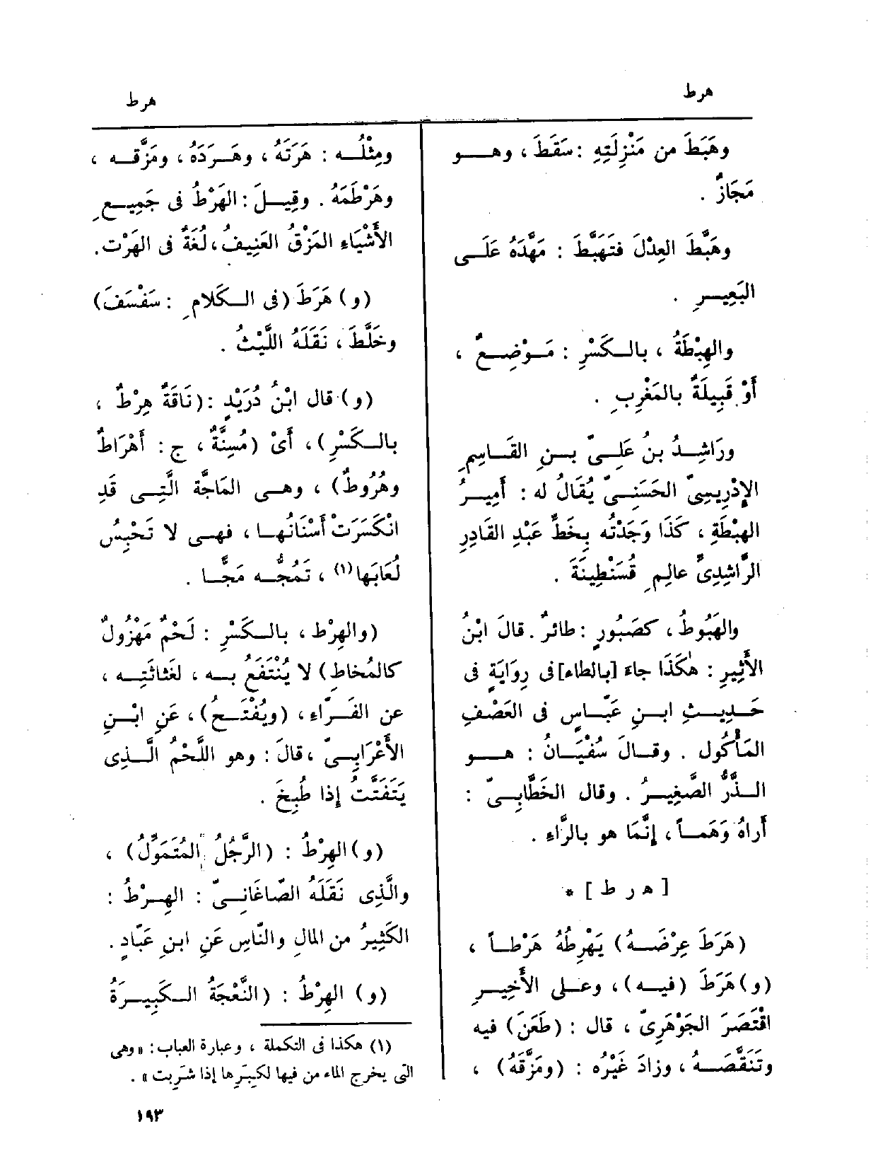 وهَرَطَ فِي الكَلامِ: سَفْسَفَ وخَلَّطَ، نَقَلَهُ اللَّيْثُ. وَقَالَ ابْنُ دُرَيْدٍ: نَاقَةٌ هِرْطٌ، بالكَسْرِ، أَيْ مُسِنَّةٌ، ج: أَهْراطٌ وهُرُوطٌ، وَهِي المَاجَّة الَّتِي قَدِ انْكَسَرَتْ أَسْنَانُها، فَهِيَ لَا تَحْبِسُ لُعَابَه، تَمُجُّه مَجَّاً.