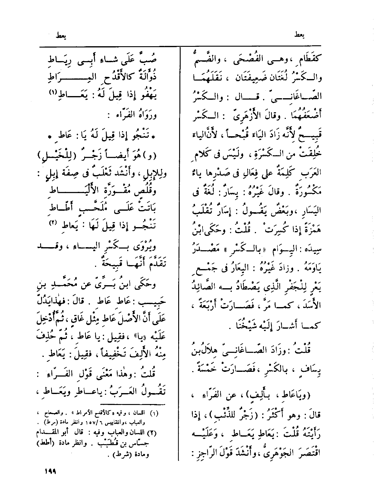 قالَ: فَهَذَا يَدُلّ عَلَى أَنَّ الأَصْلَ عَاطِ مِثْل غَاقٍ، ثُمَّ أُدْخِلَ عَلَيْه يَا، فقِيل: يَا عاطِ، ثُمّ حُذِفَ مِنْهُ الأَلِفَ تَخْفِيفاً، فقِيلَ: يَعَاطِ. قُلْتُ: وَهَذَا مَعْنَى قَوْلِ الفَرّاءِ: تَقُولُ العَرَبُ: ياعاطِ ويَعَاطِ،