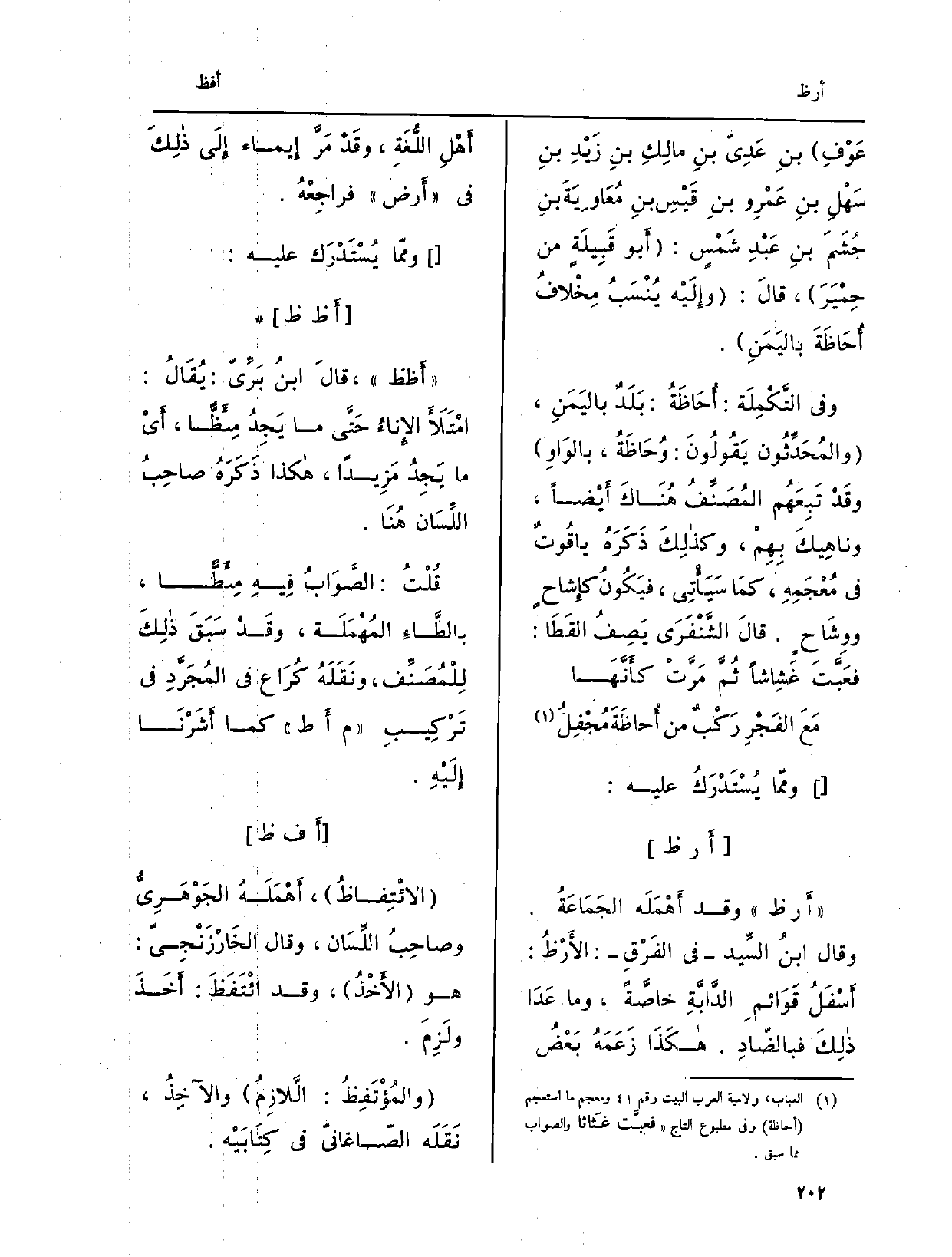 } أرظ وَقد أَهْمَلَهُ الجَمَاعَةُ. وَقَالَ ابنُ السَّيد فِي الفَرْقِ: {الأَرْظُ: أَسْفَلُ قَوَائمِ الدَّابَّةِ خاصَّةً، وَمَا عَدَا ذلِكَ فبالضّادِ. هكَذَا زَعَمَهُ بَعْضُ أَهْلِ اللُّغَةِ، وقَدْ مَرَّ إِيماء إِلَى ذلِكَ فِي أَرض فراجِعْهُ.