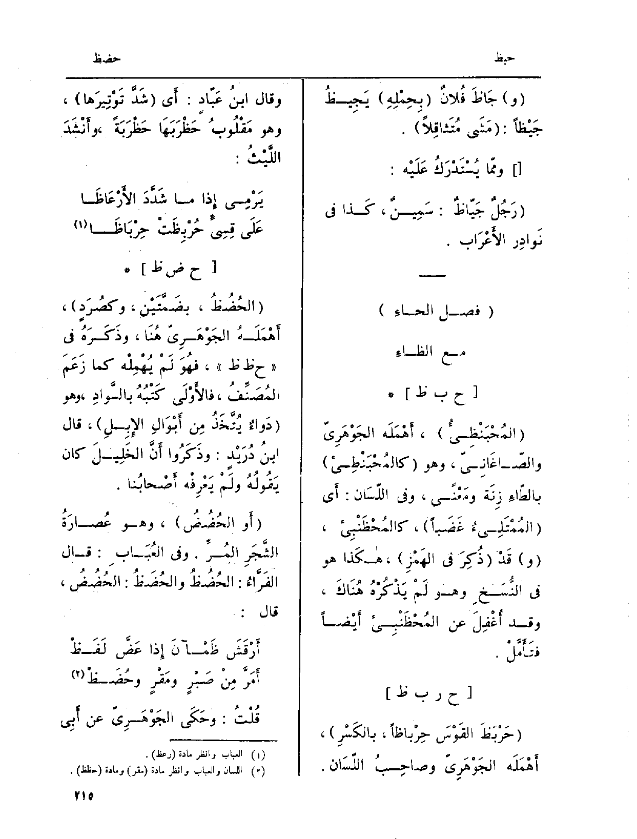 الحُضُظُ، بضَمَّتَيْن، وكصُرَدٍ، أَهْمَلَهُ الجَوْهَرِيّ هُنَا، وذَكَرَهُ فِي ح ظ ظ، فهُوَ لَمْ يُهْمِلْه كَمَا زَعَمَ المُصَنِّفُ، فالأَوْلَى كَتْبُهُ بالسَّوادِ، وَهُوَ دَواءٌ يُتَّخَذُ مِنْ أَبْوَالِ الإِبِلِ، قَالَ ابنُ دُرَيْدٍ: وذَكَرُوا أَنَّ الخَلِيلَ كَانَ يَقُولُهُ ولَمْ يَعْرِفْه أَصْحابُنا. أَو الحُضُضُ، وَهُوَ عُصارَةُ الشَّجَرِ المُرِّ. وَفِي العُبَابِ: قَالَ الفَرَّاءُ: الحُضَظُ: والحضظ الحُضُضُ، قَالَ: