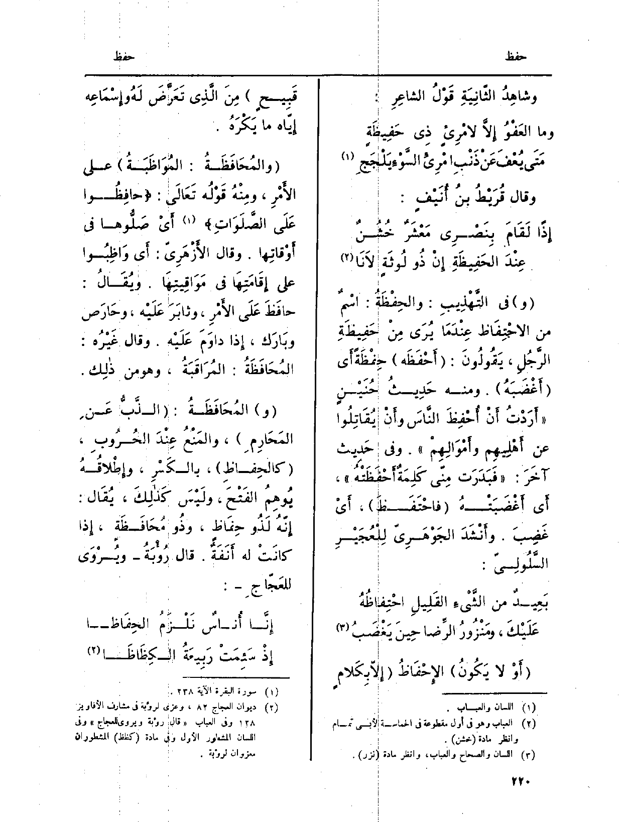 والمُحَافَظَةُ: الذَبُّ عَنِ المَحَارِمِ، والمَنْعِ عِنْدَ الحُرُوبِ، كالحِفاظِ، بالكَسْرِ، وإِطْلاقُهُ يُوهِمُ الفَتْحَ، ولَيْسَ كَذِلِكَ يُقَال إِنَّه لذُو حفاظ، وَذُو مُحَافظَة، إِذَا كانَتْ لَهُ أَنَفَةٌ. قالَ رُؤْبَةُ ويُرْوَى للعَجّاجِ: