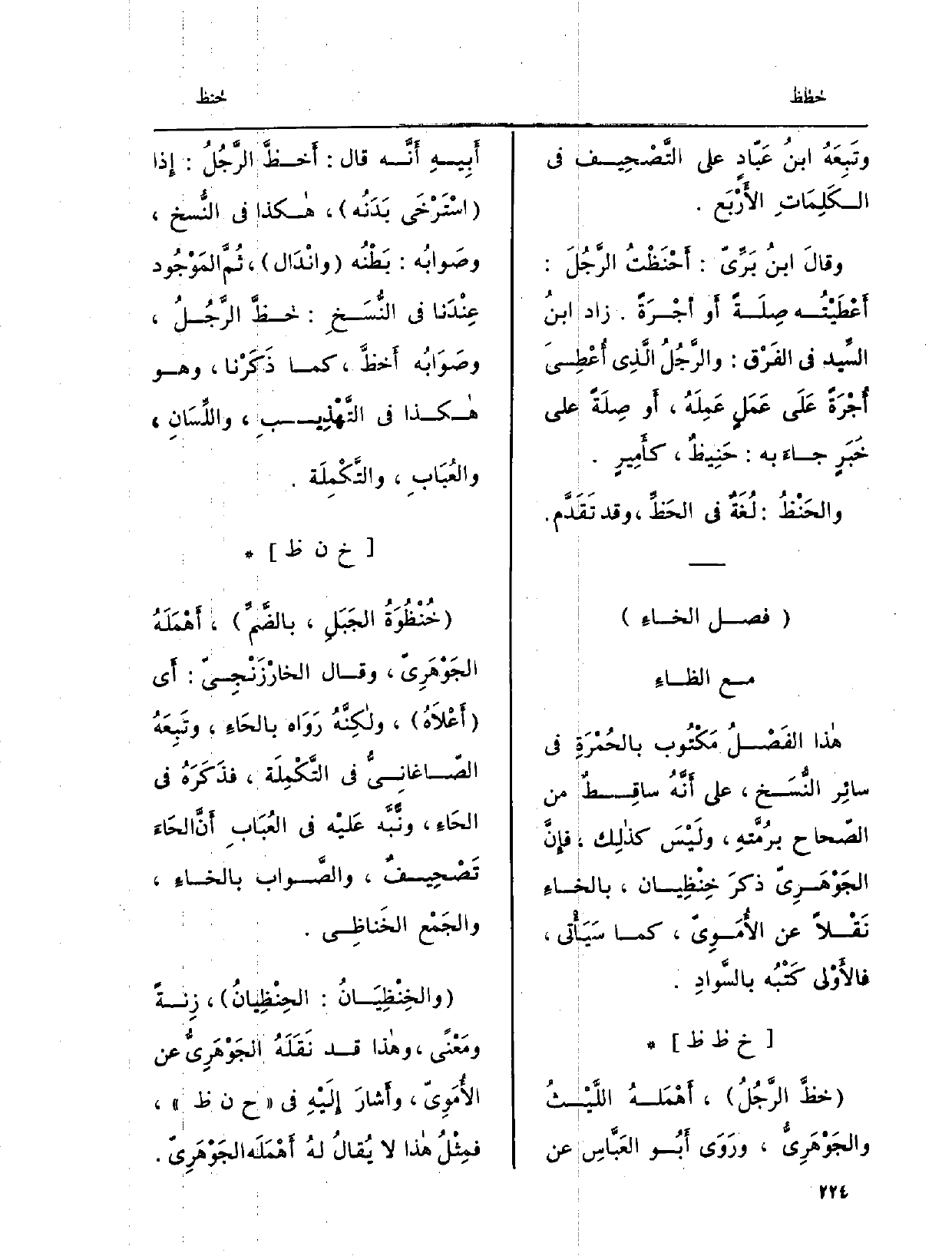 خظَّ الرَّجُلُ، أَهْمَلهُ اللَّيْثُ والجَوْهَرِيُّ، ورَوَى أَبُو العَبَّاسِ عَن أَبِيهِ أَنَّه قَالَ: أَخظَّ الرَّجُلُ: إِذا اسْتَرْخَى بَدَنُه، هَكَذَا فِي النُّسخ، وصَوابُه: بَطْنُه وانْدَال، ثُمَّ المَوْجُود عِنْدَنَا فِي النُّسَخِ: خظَّ الرَّجُلُ، وصَوَابُه أخظَّ، كَمَا ذَكَرْنا، وَهُوَ هَكَذَا فِي التَّهْذِيبِ، واللِّسَانِ، والعُبَابِ، والتَّكْمِلَة.