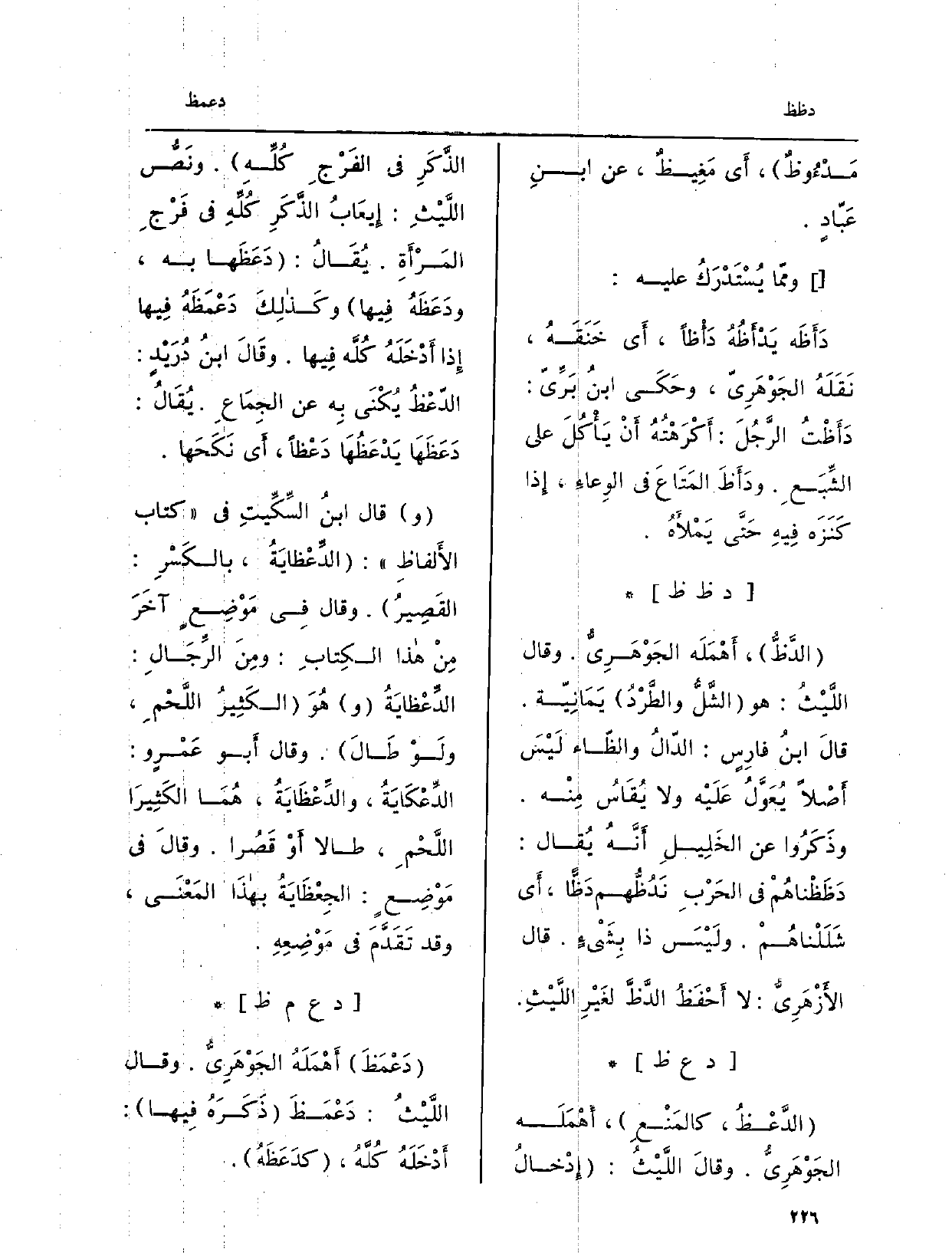 الدَّعْظُ، كالمَنْعِ، أهْمَلَه الجَوْهَرِيُّ. وقالَ اللَّيْثُ: إِدْخالُ الذِكَرِ فِي الفَرْجِ كُلِّهِ. نَصُّ اللَّيْثِ: إِيعَابُ الذَكَرِ كُلِّهِ فِي فَرْجِ المَرْأَةِ. يُقَالُ: دَعَظَها بِهِ، ودَعَظَهُ فِيها وكَذلِكَ دَعْمَظَهُ فِيها إِذا أَدْخَلَهُ كُلَّهُ فِيها. وقالَ ابنُ دُرَيْدٍ: الدَّعْظُ يُكْنَى بِهِ عَن الجِمَاعِ. يُقَالُ: دَعَظَهَا يَدْعَظُهَا دَعْظاً، أَي نَكَحَها.
