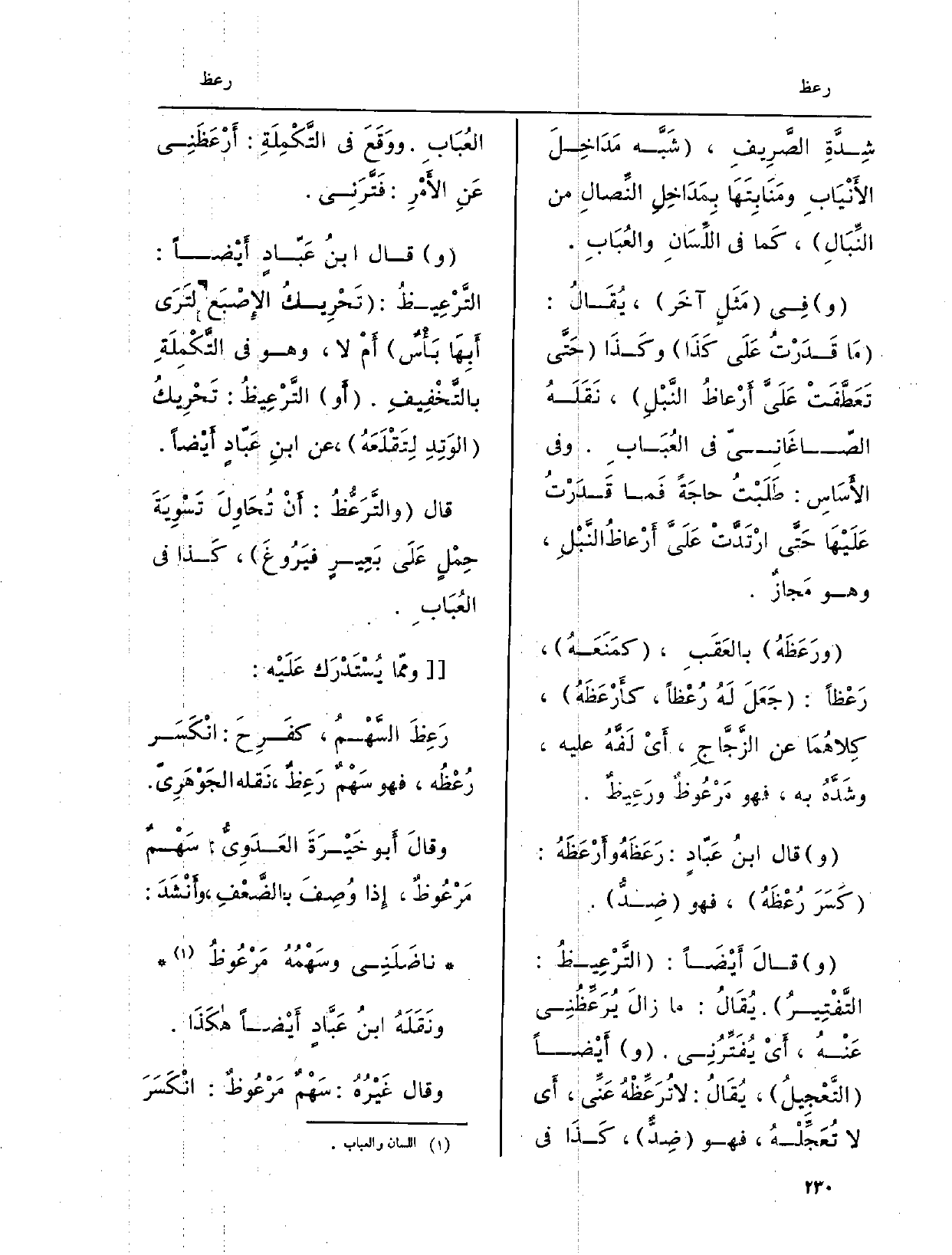 قَالَ والتَّرَعُّظُ: أَنْ تُحَاوِلَ تَسْوِيَةَ حِمْلٍ عَلَى بَعِيرٍ فَيَرُوغَ، كَذَا فِي العُبَابِ وممّا يُسْتَدْرَكُ عَلَيْهِ:) رَعِظَ السَّهْمُ، كفَرِحَ: انْكَسَر رُعْظُه، فَهُوَ سَهْمٌ رَعِظٌ، نَقله الجَوْهَرِيّ. وَقَالَ أَبو خَيْرَةَ العَدَوِيُّ: سَهْمٌ مَرْعُوظٌ، إِذا وُصِفَ بالضَّعْفِ، وأَنْشَدَ: ناضَلَنِي وسَهْمُهُ مَرْعُوظُ ونَقَلَهُ ابنُ عَبّادٍ أَيْضَاً هكَذَا. وَقَالَ غَيْرُهُ: سَهْمٌ مَرْعُوظٌ: انْكَسر
