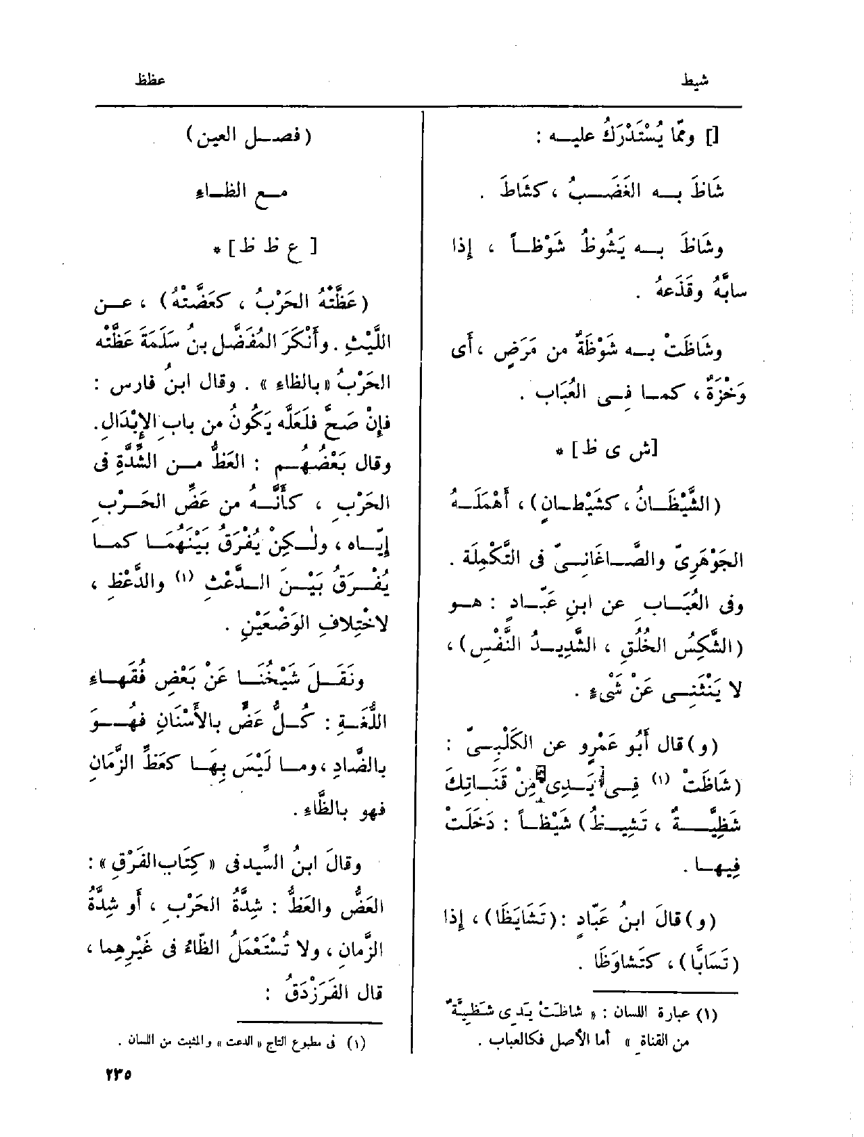 ونَقَلَ شَيْخُنَا عَنْ بَعْضِ فُقَهاءِ اللُّغَةِ: كُلُّ عَضٍّ بالأَسْنَانِ فهُوَ بالضّادِ، وَمَا لَيْسَ بِها كعَظِّ الزَّمَانِ فَهُوَ بالظَّاءِ. وقالَ ابنُ السِّيد فِي كِتَاب الفَرْقِ: العَضُّ} والعَظُّ: شِدَّةُ الحَرْبِ، أَو شِدَّةُ الزَّمانِ، وَلَا تُسْتَعْمَلُ الظّاءُ فِي غَيْرِهِما، قَالَ الفَرَزْدَقُ: