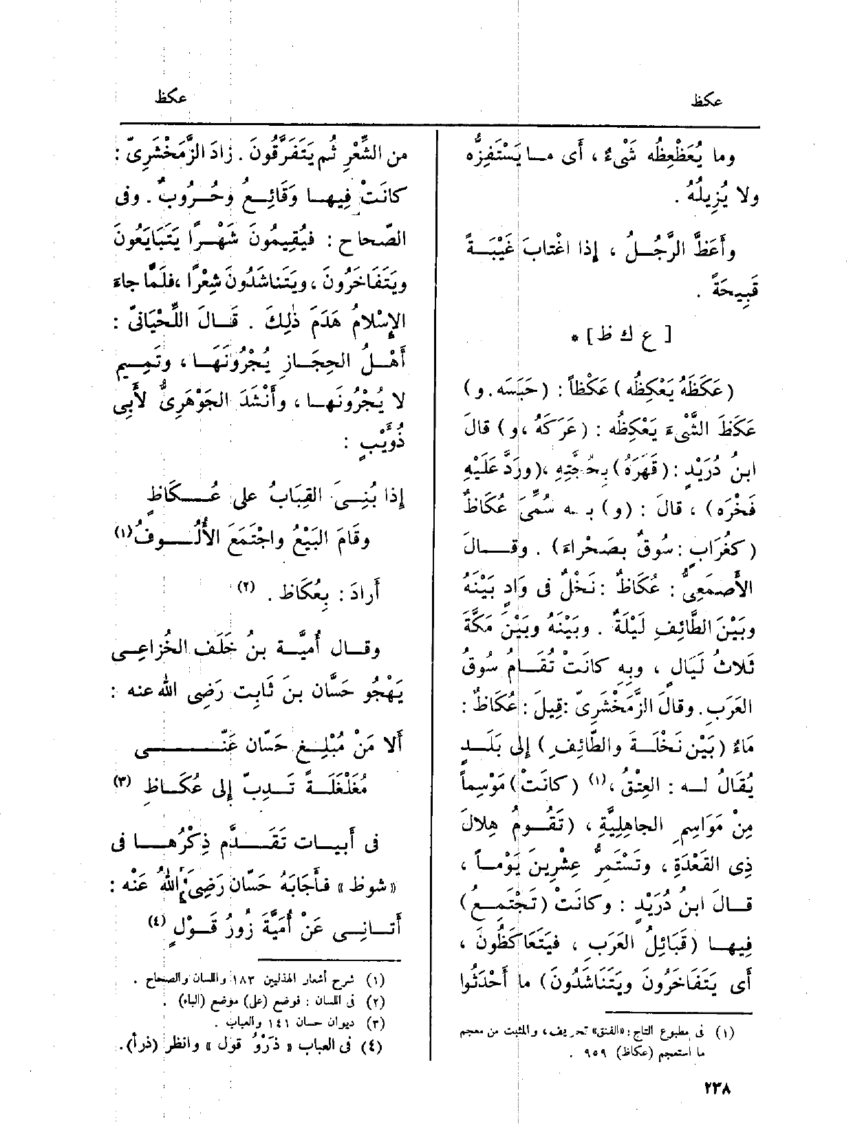 عَكَظَهُ يَعكِظُه عَكْظاً: حَبَسَه. وعَكَظَ الشَّيْءَ يَعْكِظُه: عَرَكَهُ، وقالَ ابنُ دُرَيْدٍ: قهَرَهُ بِحُجَّتِهِ، ورَدَّ عَلَيْهِ فَخْرَه، قالَ: وَبِه سُمِّيَ عُكَاظٌ كغُرَابٍ: سُوقٌ بصَحْراءَ. وقالَ الأَصْمَعِيُّ: عُكَاظٌ: نَخْلٌ فِي وَادٍ بَيْنَهُ وبَيْنَ الطَّائِفِ لَيْلَةٌ. وبَيْنَهُ وبَيْنَ مَكَّةَ ثَلاثُ لَيَالٍ، وبِهِ كانَتْ تُقَامُ سُوقُ العَرَبِ. وقالَ الزَّمَخْشَرِيُّ: قِيلَ عُكَاظٌ: مَاءٌ بَيْنَ نَخْلَةَ والطّائِفِ إِلى بَلَدٍ يُقَالُ لَهُ: العِتْقُ، كانَتْ مَوْسِماً مِنْ مَوَاسِمِ الجاهِلِيَّةِ، تَقُومُ هِلالَ ذِي القَعْدَةِ، وتَسْتَمِرُّ عِشْرِينَ يَوْماً، قالَ ابنُ دُرَيْدٍ: وكانَتْ تَجْتَمعُ فِيها قَبَائِلُ العَرَبِ، فَيَتَعَاكَظُونَ، أَي يَتَفَاخَرُونَ ويَتَنَاشَدُونَ مَا أَحْدَثُوا من الشِّعْرِ ثُمَّ يَتَفَرَّقُونَ. زادَ الزَّمَخْشَرِيّ: كانَتْ فِيها وَقَائِعُ وحُرُوبٌ. وَفِي الصّحاح: فيُقِيمُونَ شَهْراً يَتَبَايَعُونَ ويَتَفَاخَرُونَ، ويَتَناشَدُونَ شِعْراً، فلَمَّا جاءَ الإِسْلامُ هَدَمَ ذلِكَ. قَالَ اللِّحْيَانيّ: أَهْلُ الحِجَازِ يُجْرُونَهَا، وتَمِيم لَا يُجْرُونَها، وأَنْشَدَ الجَوْهَرِيُّ لأَبِي ذُؤَيْبٍ: