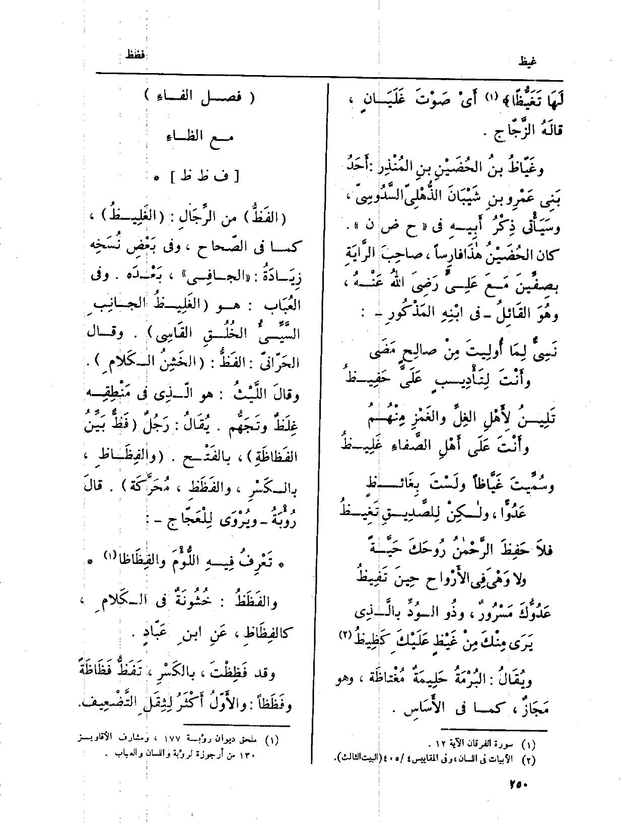 } الفَظُّ من الرِّجَالِ: الغَلِيظُ، كَمَا فِي الصّحاح، وَفِي بَعْضِ نُسَخِه زِيَادَةُ: الجافِي، بَعْدَهُ. وَفِي العُبَاب: هُوَ الغَلِيظُ الجانِبِ السَّيِّئُ الخُلُقِ القَاسِي. وَقَالَ الحَرّانيّ: الفَظُّ: الخَشِنُ الكَلامِ. وقالَ اللَيْثُ: هُوَ الّذِي فِي مَنْطِقِه غِلَظٌ وتَجَهُّم. يُقَالُ: رَجُلٌ {فَظٌ بَيِّنُ} الفَظاظَةِ، بالفَتْح. {والفِظَاظِ، بالكَسْرِ،} والفَظَظِ، مُحَرَّكَة. قالَ رُؤْبَةُ ويُرْوَى لِلْعَجاج: تَعْرِفُ فِيهِ اللُّؤْمَ {والفِظَاظا والفَظَظُ: خُشُونَةٌ فِي الكَلامِ،} كالفِظَاظِ، عنِ ابنِ عَبّادٍ.