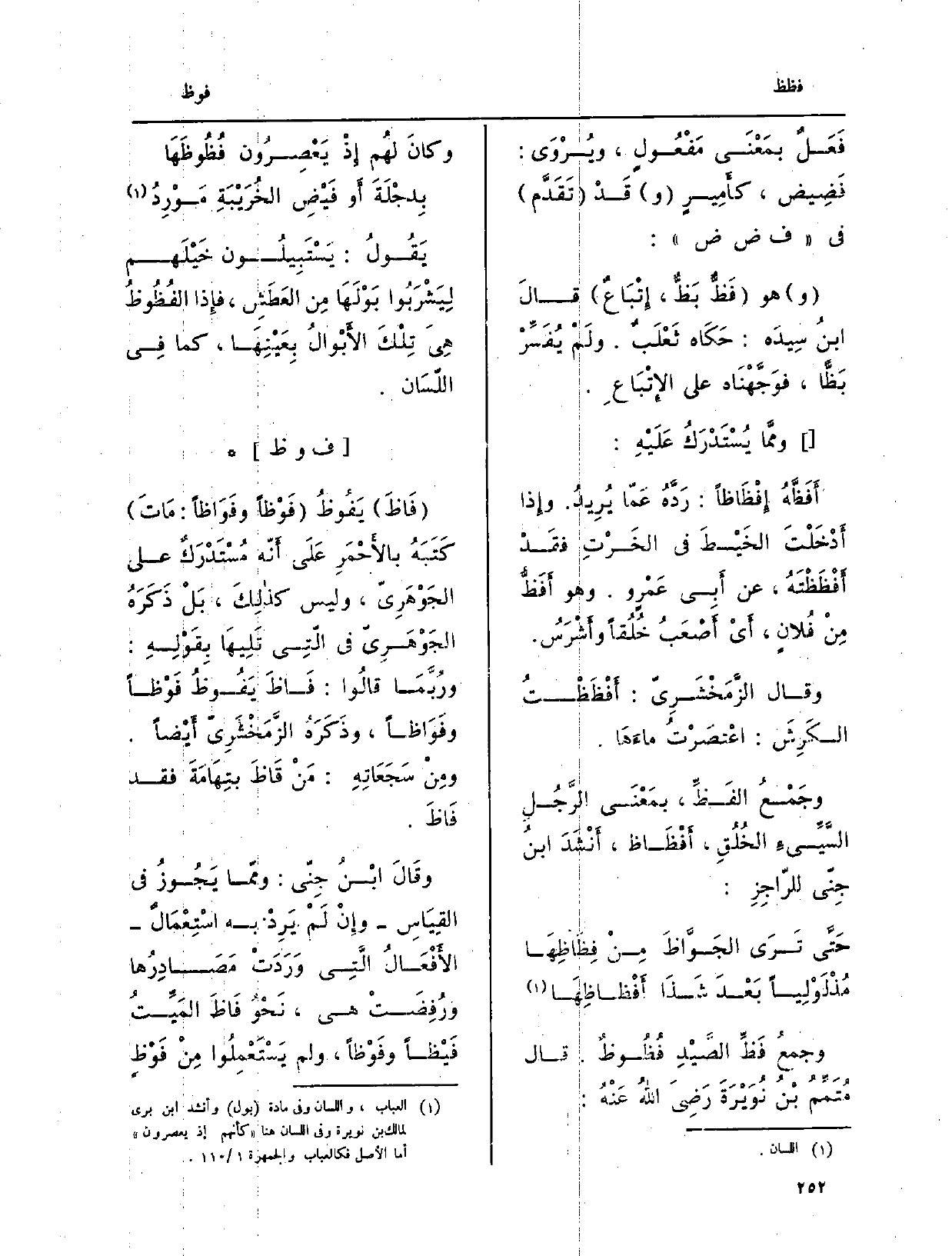وجمعُ {فَظِّ الصِّيْدِ} فُظُوظٌ. قَالَ مُتَمِّمُ بْنُ نُوَيْرَةَ رَضِيَ اللهُ عَنْهُ: