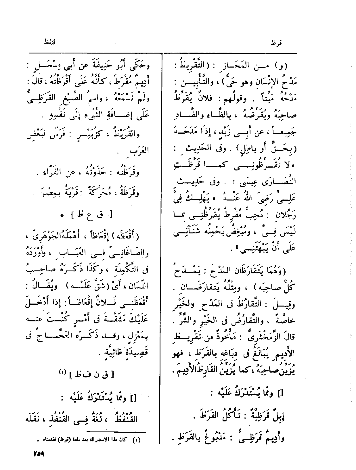 لَا تُقَرِّظُونِي كَمَا قَرَّظَتِ النَّصَارَى عِيسَى. وَفِي حَدِيث عَلِيٍّ رَضِيَ اللهُ عَنْهُ يَهْلِكُ فِيَّ رَجُلانِ: مُحِبٌ مُفْرِطٌ يُقَرِّظُنِي بِمَا لَيْسَ فِيَّ، ومُبْغِضٌ يَحْمِلُه شَنْآنِي عَلَى أَنْ يَبْهَتَنِي. وَهُمَا يَتَقَارَظَان المَدْحَ: يَمْدَحُ كُلٌّ صاحِبَهُ، ومِثْلُهُ يَتَقارَضَانِ. وقِيلَ: التَّقارُظُ فِي المَدْحِ والخَيْرِ خاصَّةً، والتَّقارُضُ فِي الخَيْرِ والشَّرِّ. قالَ الزَّمَخْشَرِيُّ: مَأْخُوذٌ من تَقْرِيظِ الأَدِيمِ يُبَالَغُ فِي دِبَاغِهِ بالقَرَظِ، فَهُوَ يُزَيِّنُ صاحِبَهُ، كَمَا يُزَيِّنُ القَارِظُ الأَدِيمَ.