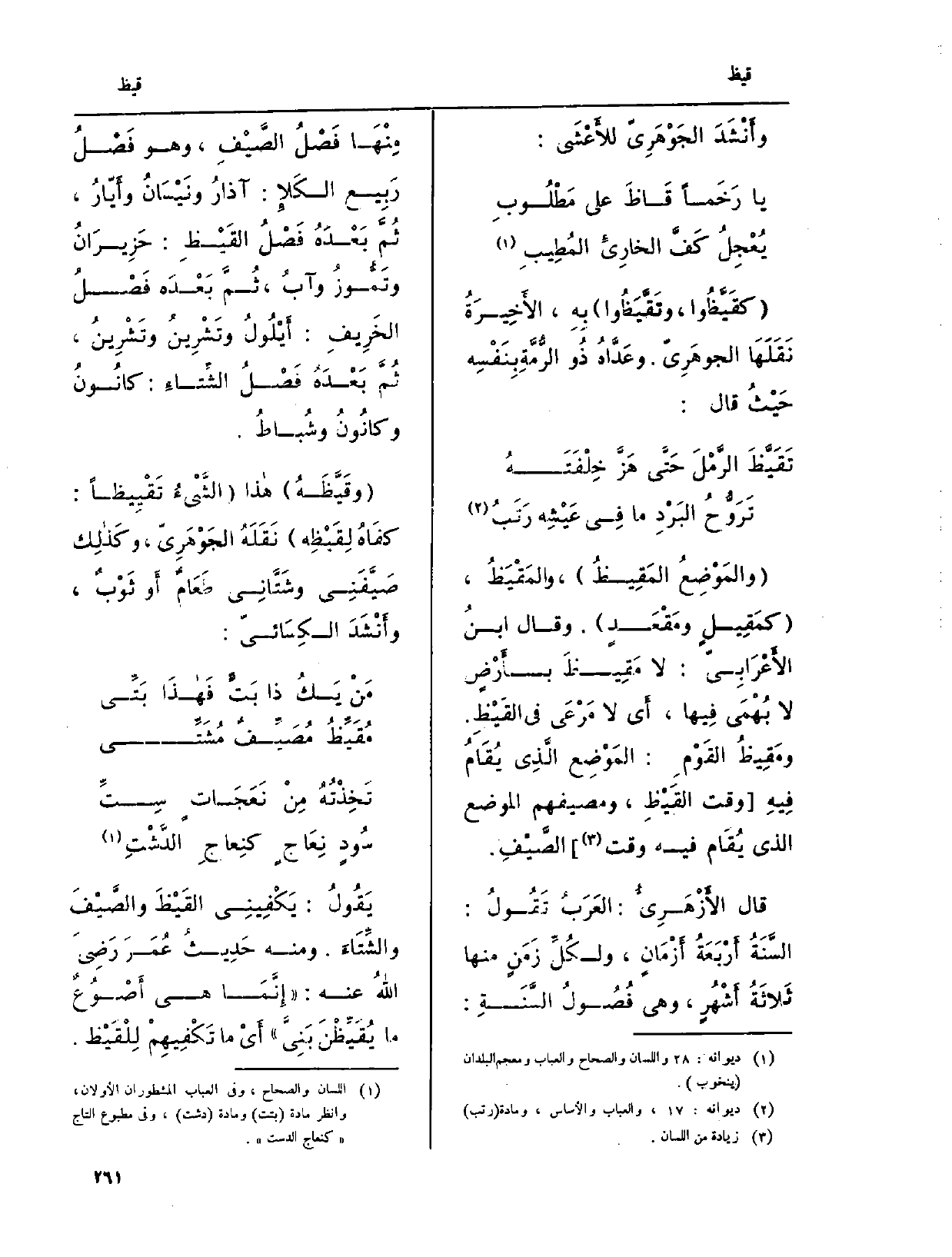 والمَوْضِعُ} المَقِيظُ، {والمَقْيَظُ، كمَقِيلٍ ومَقْعَدٍ. وَقَالَ ابنُ الأَعْرَابِيّ: لَا} مَقِيظَ بأَرْضٍ لَا بُهْمى فِيها،) أَي لَا مَرْعَى فِي القَيْظِ. {ومَقِيظُ القَوْمِ: المَوْضِع الَّذِي يُقَامُ فِيهِ وَقت القَيْظِ، ومصيفهم الْموضع الَّذِي يُقَامُ فِيهِ وَقت الصَّيْفِ. قَالَ الأَزْهَرِيُّ: العَرَبُ تَقُولُ: السَّنَةُ أَرْبَعَةُ أزْمَانٍ، ولكُلِّ زَمَنٍ مِنْهَا ثَلاثَةُ أَشْهُرٍ، وَهِي فُصُولُ السَّنَةِ: مِنْها فَصْلُ الصَّيْفِ، وَهُوَ فَصْلُ رَبِيع الكَلإِ: آذارُ ونَيْسَانُ وأَيّارُ، ثُمَّ بَعْدَهُ فَصْلُ القَيْظِ: حَزِيرَانُ وتَمُّوزُ وآبُ، ثُمَّ بَعْدَه فَصْلُ الخَرِيفِ: أَيلُولُ وتَشْرِينُ وتَشْرينُ، ثُمَّ بَعْدَهُ فَصْلُ الشِّتاءِ: كانُونُ وكانُونُ وشُباطُ.