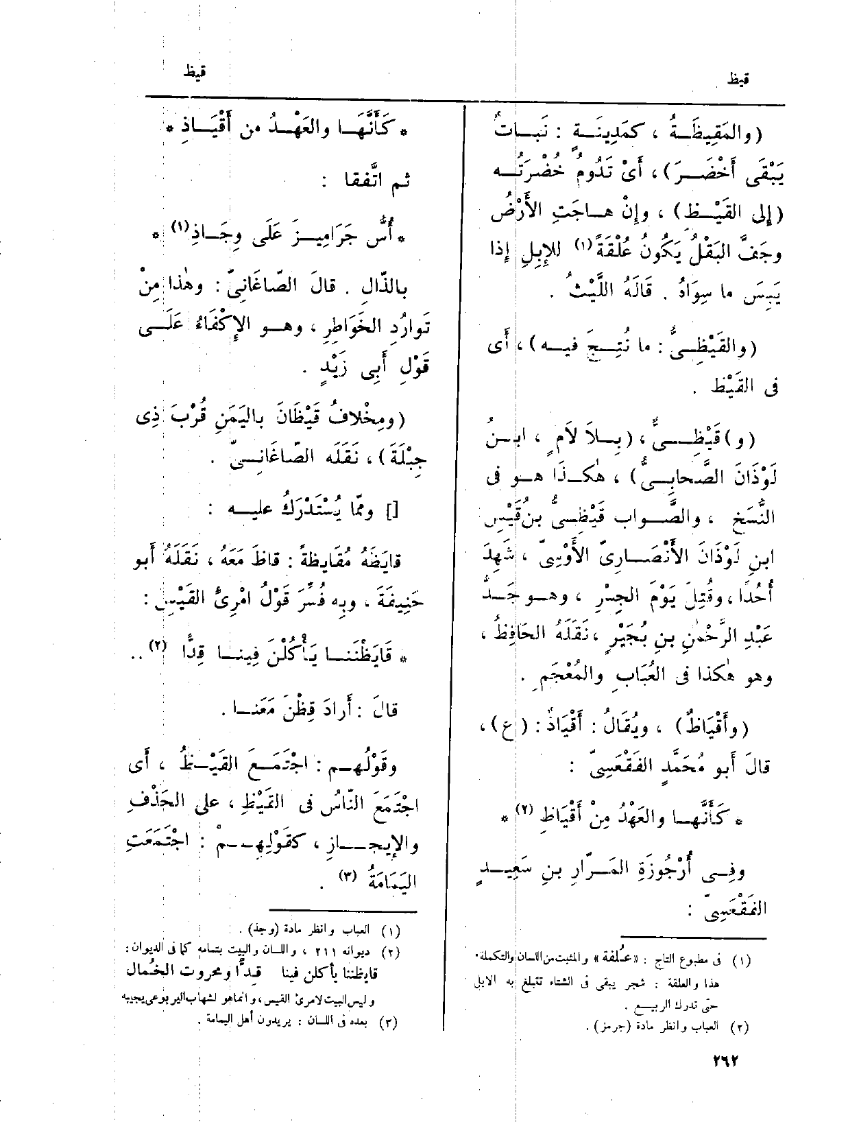 {- والقَيْظِيُّ: مَا نُتِجَ فِيهِ، أَي فِي القَيْظ. (و) } - قَيْظِيٍّ، بِلاَ لاَمٍ، ابنُ لَوْذَانَ الصَّحابِيُّ، هكذَا هُوَ فِي النُّسَخ، والصّواب قَيْظِيُّ بنُ قَيْسِ ابنِ لَوْذَانَ الأَنْصَارِيّ الأَوْسِيّ، شَهِدَ أُحُداً، وقُتِلَ يَوْمَ الجِسْرِ، وَهُوَ جَدُّ عَبْدِ الرّحْمنِ بنِ بُجَيْرٍ، نَقَلَهُ الحَافِظُ، وَهُوَ هَكَذَا فِي العُبَابِ والمُعْجَمِ.