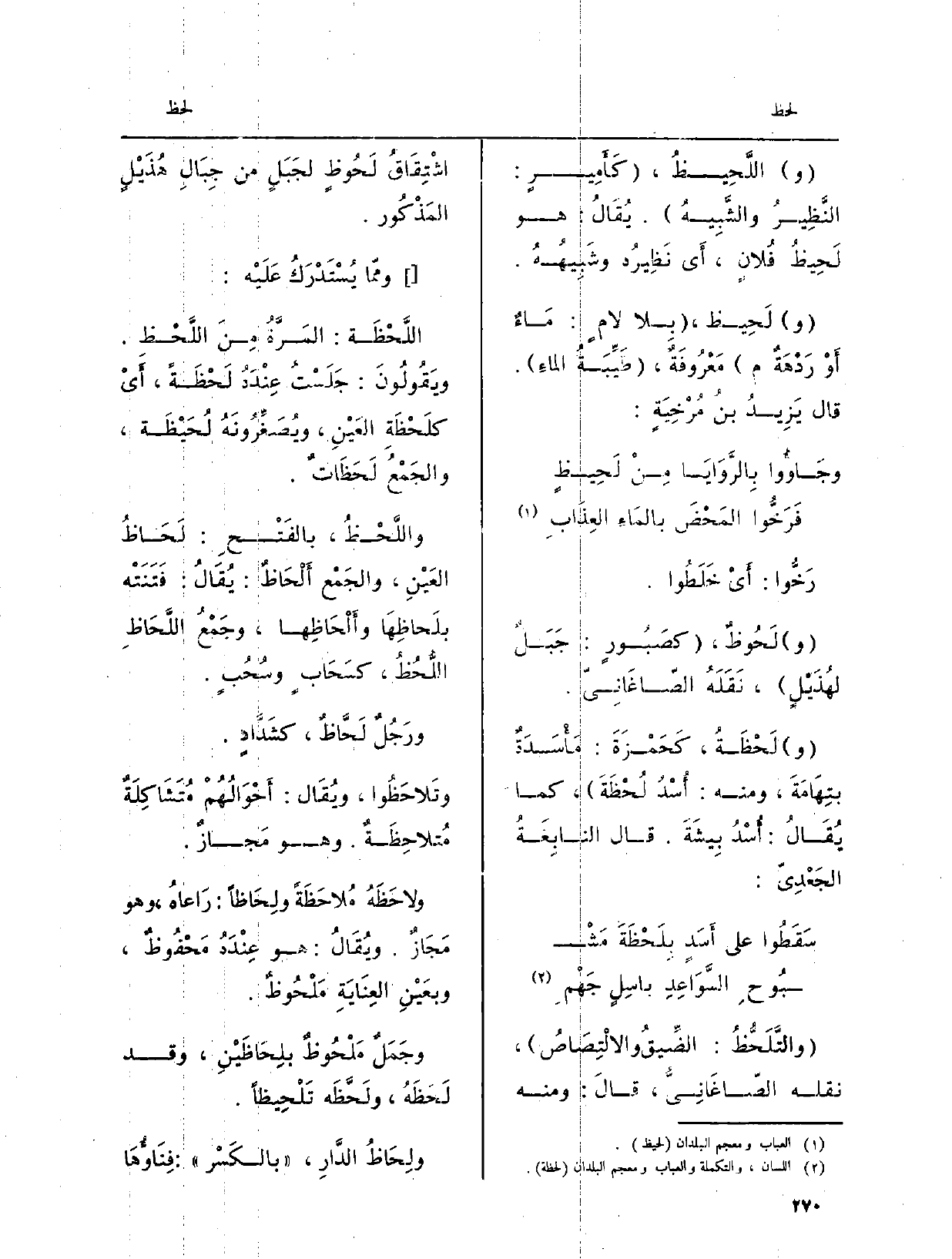وجَمَلٌ مَلْحُوظٌ بلِحَاظَيْنِ، وَقد لَحَظَهُ، ولَحَّظَه تَلْحِيظاً. ولِحَاظُ الدَّارِ، بالكَسْرِ: فِنَاؤُهَا.