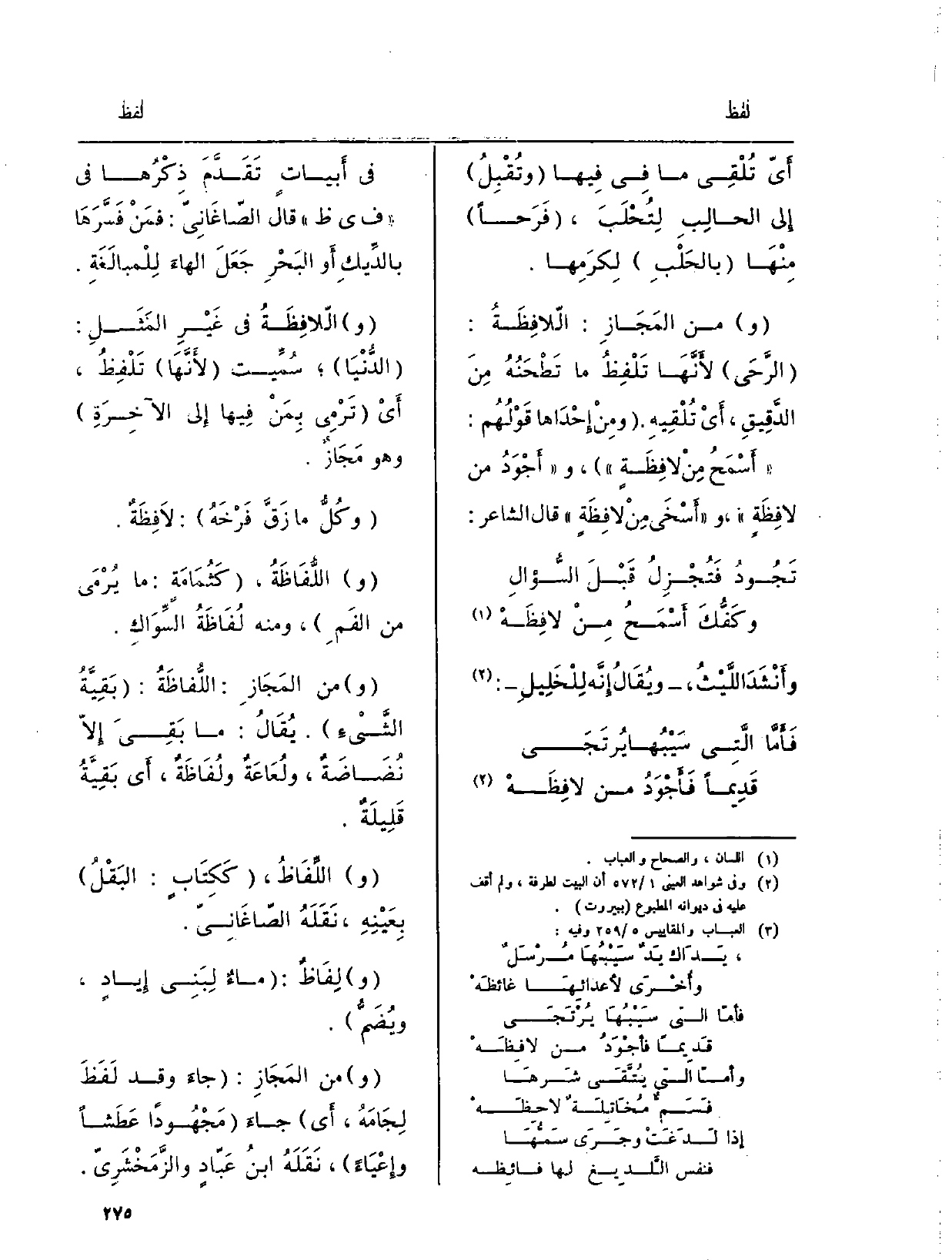 فِي أَبياتٍ تَقَدَّمَ ذِكْرُها فِي ف ي ظ، قَالَ الصّاغَانِيُّ: فمَنْ فَسَّرَها بالدِّيكِ أَو البَحْرِ جَعَلَ الهاءَ لِلْمبالَغَةِ. واللاّفِظَةُ فِي غَيْرِ المَثَلِ: الدُّنْيَا، سُمِّيت لأَنَّها تَلْفِظُ، أَيْ تَرْمِي بِمَنْ فِيها إِلى الآخِرَةِ وَهُوَ مَجَازٌ.)