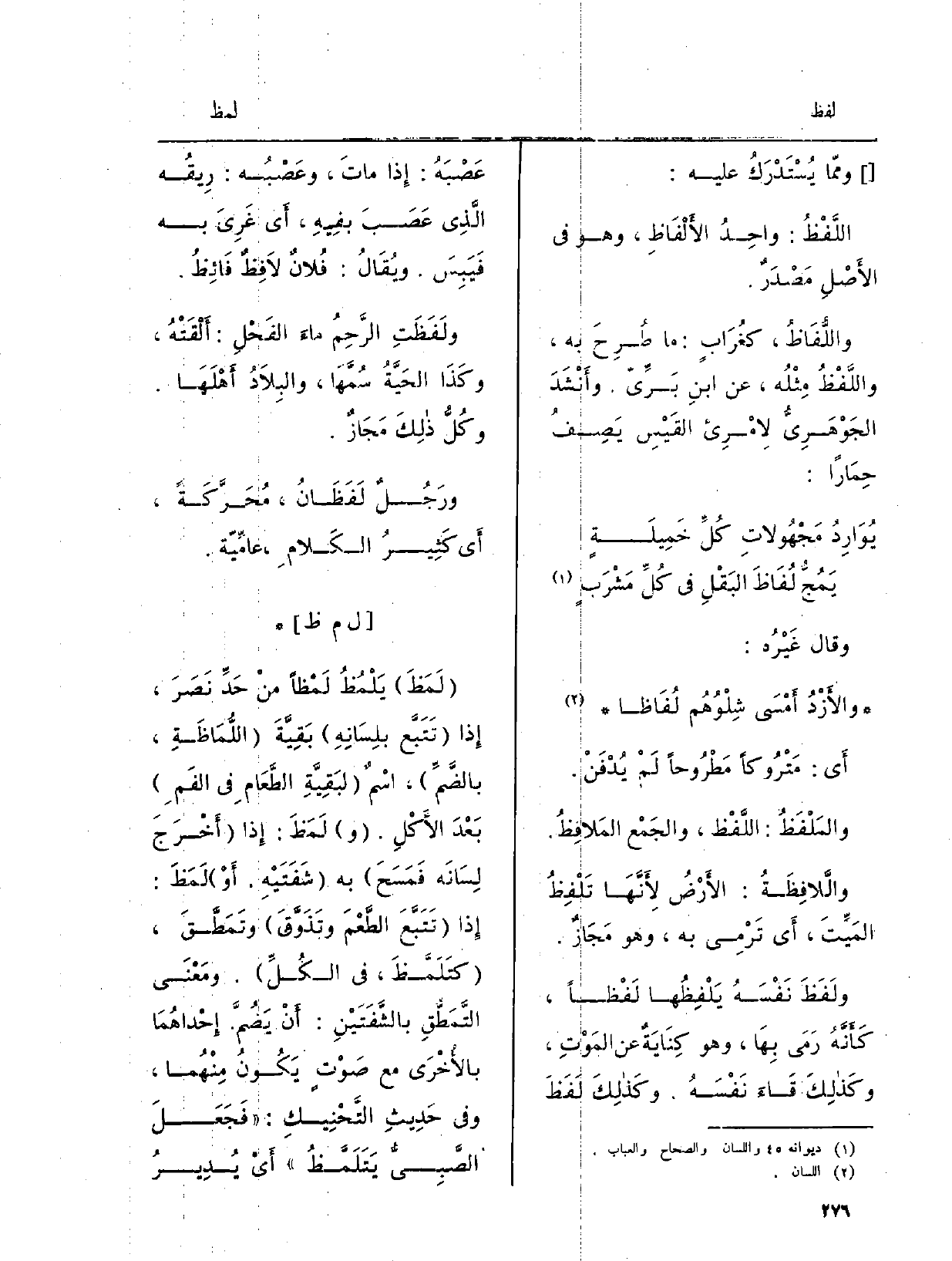 واللافِظَةُ: الأَرْضُ لأَنَّها تَلْفْظُ المَيِّتَ، أَي تَرْمِي بِهِ، وَهُوَ مَجاَزٌ. ولَفَظَ نَفْسَهُ يَلْفِظُها لَفْظاً، كَأَنَّهُ رَمَى بِهَا، وَهُوَ كِنايَةٌ عَن المَوْتِ، وكَذلِكَ قَاءَ نَفْسَه. وكَذلِكَ لَفَظَ عَصْبَهُ: إِذا ماتَ، وعَصْبُه: رِيقُه الَّذِي تعَصَبَ بفِيهِ، أَي غَرِيَ بِهِ فَيَبِسَ. ويُقَالُ: فُلانٌ لاَفِظٌ فائِظُ.