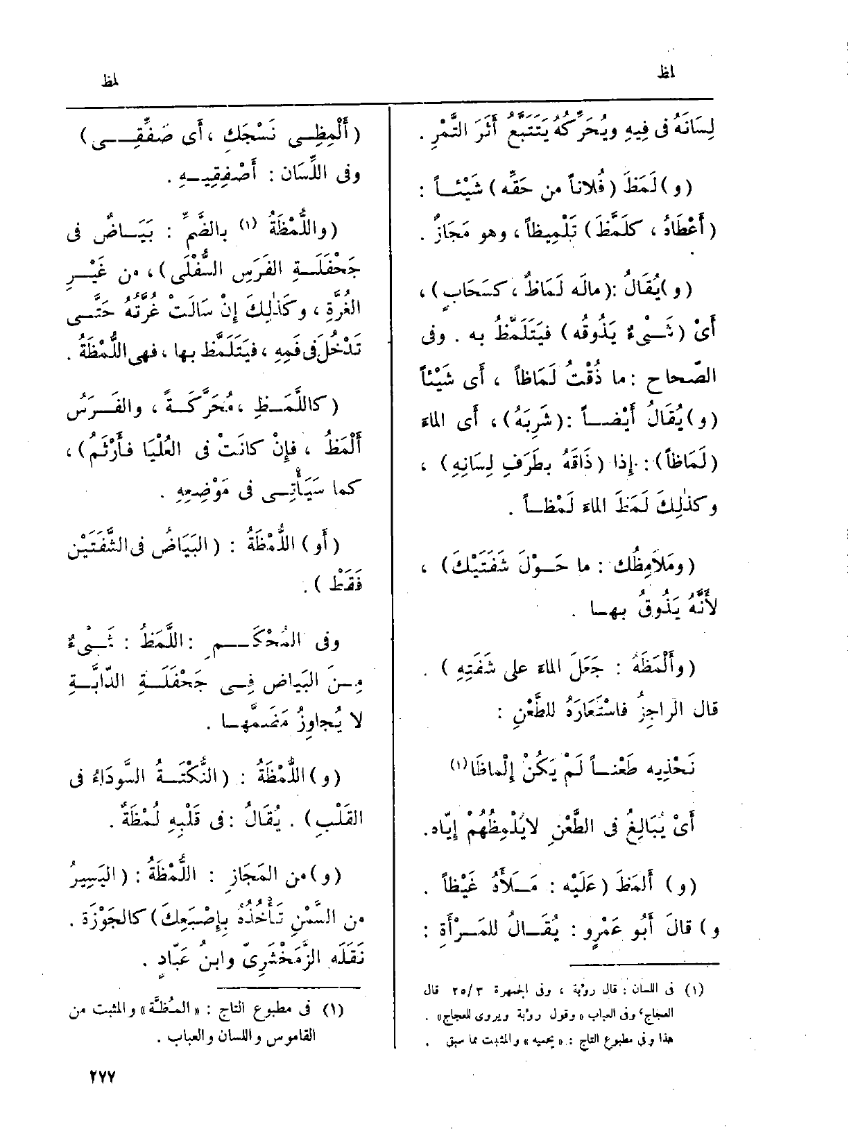 ولَمَظَ فُلاناَ من حَقِّه شَيْئاً: أَعْطاهُ، كلَمَّظَ تَلْمِيظاً، وَهُوَ مَجَازٌ. ويُقَالُ: مالَهُ لَمَاظٌ، كسَحَابٍ، أَيْ شَيْءٌ يَذُوقُه فَيَتَلَمَّظُ بِهِ. وَفِي الصّحاح: مَا ذُقْتُ لَمَاظاً، أَي شيْئاً ويُقَالُ أَيْضاً: شَرِبَهُ، أَي الماءَ لَمَاظاً: إِذا ذَاقَهُ بطَرَفِ لِسَانِهِ، وكذلِكَ لَمَظَ الماءَ لَمْظاً.
