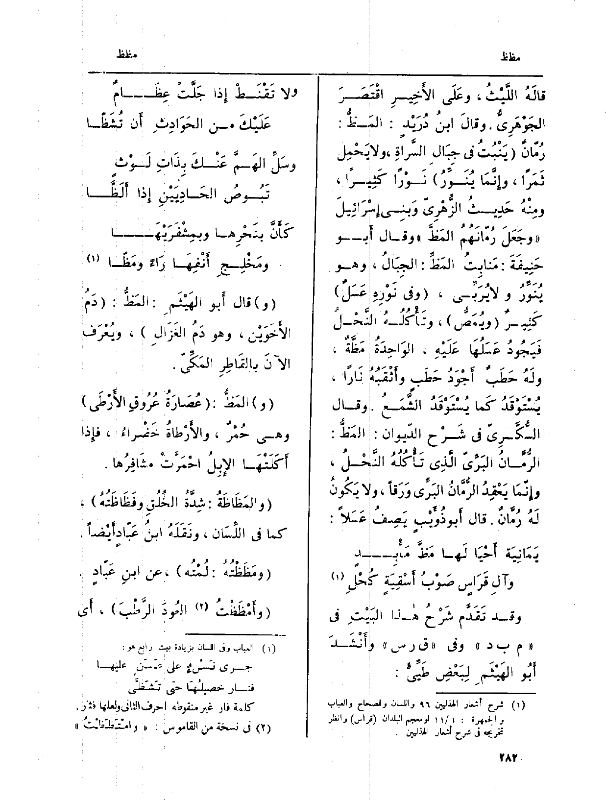 وسَلِّ الهَمَّ عَنْكَ بِذَاتِ لَوْثٍ تَبُوصُ الحَادِيَيْنِ إِذا أَلَظَّا كَأَنَّ بنَحْرِها وبمِشْفَرَيْهَاومَخْلِجِ أَنْفِهَا رَاءً {ومَظّا وَقَالَ أَبُو الهَيْثَمِ: المَظُّ: دَمُ الأَخَوَيْنِ، وَهُوَ دَمُ الغَزَالِ، ويُعْرف الآنَ بالقَاطِرِ المَكِّيّ.