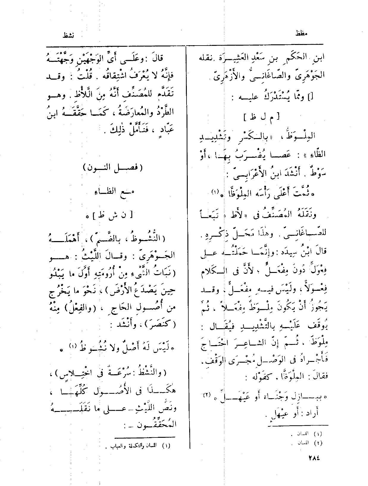 قَالَ ابْنُ سِيدَه: وإِنَّمَا حَمَلْتُه على فِعْوَلِّ دُونَ مِفْعَلٍّ، لأَنَّ فِي الكَلام فِعْوَلاًّ، ولَيْسَ مِفْعَلٍّ، لأنَّ فِي الكَلام فِعْوَلاًّ، ولَيْسَ فيهِ مِفْعَلٌّ، وَقد يَجُوزُ أَنْ يَكُونَ مِلْوَظٌ مِفْعَلاً، ثُمَّ يُوقَف عَلَيْهِ بالتَّشْدِيدِ فيُقال: مِلْوَظّ، ثُمّ إنّ الشاعِرَ احْتَاجَ فَأَجْراهُ فِي الوَصْلِ مُجْرَى الوَقْفِ، فقالَ: المِلْوَظَّا، كقَوْله: ببازِلٍ وَجْنَاءَ أَو عَيْهَلِّ أَراد: أَو عَيْهَلٍ. قالَ وعَلَى أَيّ الوَجْهَيْنِ وَجَّهْتَهُ فإِنَّهُ لَا يُعْرَفُ اشْتِقاقُه. قُلْت: وَقد تَقَدَّم للمُصَنِّفِ أَنَّهُ مِنَ الَّلأْظِ. وَهُوَ الطَّرْدُ والمُعارَضَةُ، كَمَا حَقَّقَهُ ابنُ عَبّادٍ، فتَأَمَّلْ ذلِكَ.