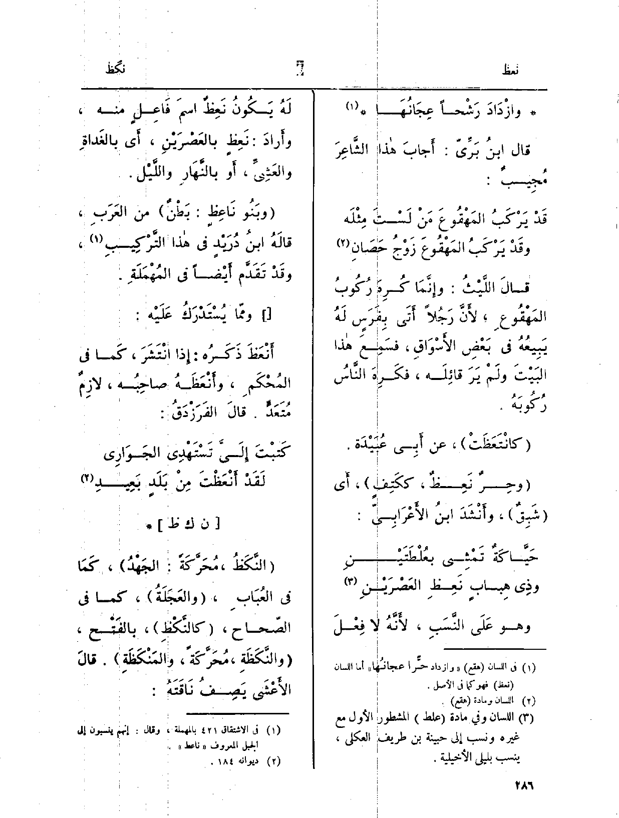 وَهُوَ عَلَى النَّسَبِ، لأَنَّهُ لَا فِعْلَ لَهُ يَكُونُ نَعِظٌ اسمَ فَاعِلِ مِنْهُ، وأَرادَ: نَعِظِ بالعَصْرَيْنِ، أَي بالغَداةِ والعَشِيّ، أَو بالنَّهَارِ والَّليْل. وبَنُو نَاعِظِ: بَطْنٌ من العَرَبِ، قالَهُ ابنُ دُرَيْدٍ فِي هَذَا التَّرْكِيبِ، وقَدْ تَقَدَّم أَيْضاً فِي المُهْمَلَةِ. وممّا يُسْتَدْرَكُ عَلَيْهِ: أَنْعَظَ ذَكَرُه: إِذا انْتَشَرَ، كَما فِي المُحْكَمِ، وأَنْعَظَهُ صاحِبُه، لازِمٌ مُتَعَدٍّ. قالَ الفَرَزْدَقُ:
