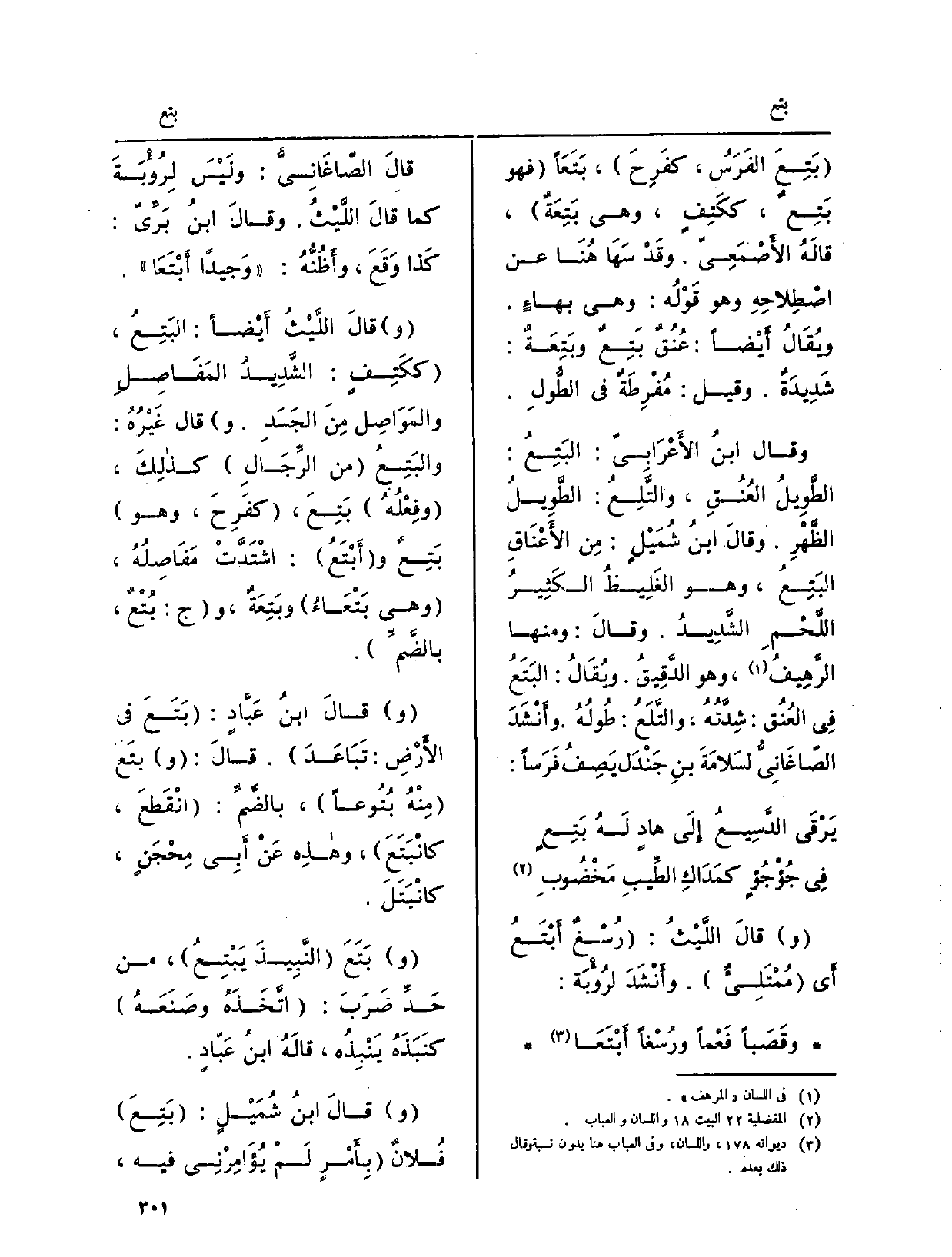 وقالَ اللَّيْثُ: رُسْغٌ أَبْتَعُ أَي مُمْتَلِئٌ. وأَنْشَدَ لرُؤْبَة: وقَصَباً فَعْماً ورُسْغاً أَبْتَعَا قالَ الصّاغَانِيُّ: ولَيْسَ لِرُؤْبَةَ كَمَا قالَ اللَّيْثُ. وقالَ ابنُ بَرِّيّ: كَذَا وَقَعَ، وأَظُنُّهُ: وَجيداً أَبْتَعَا.
