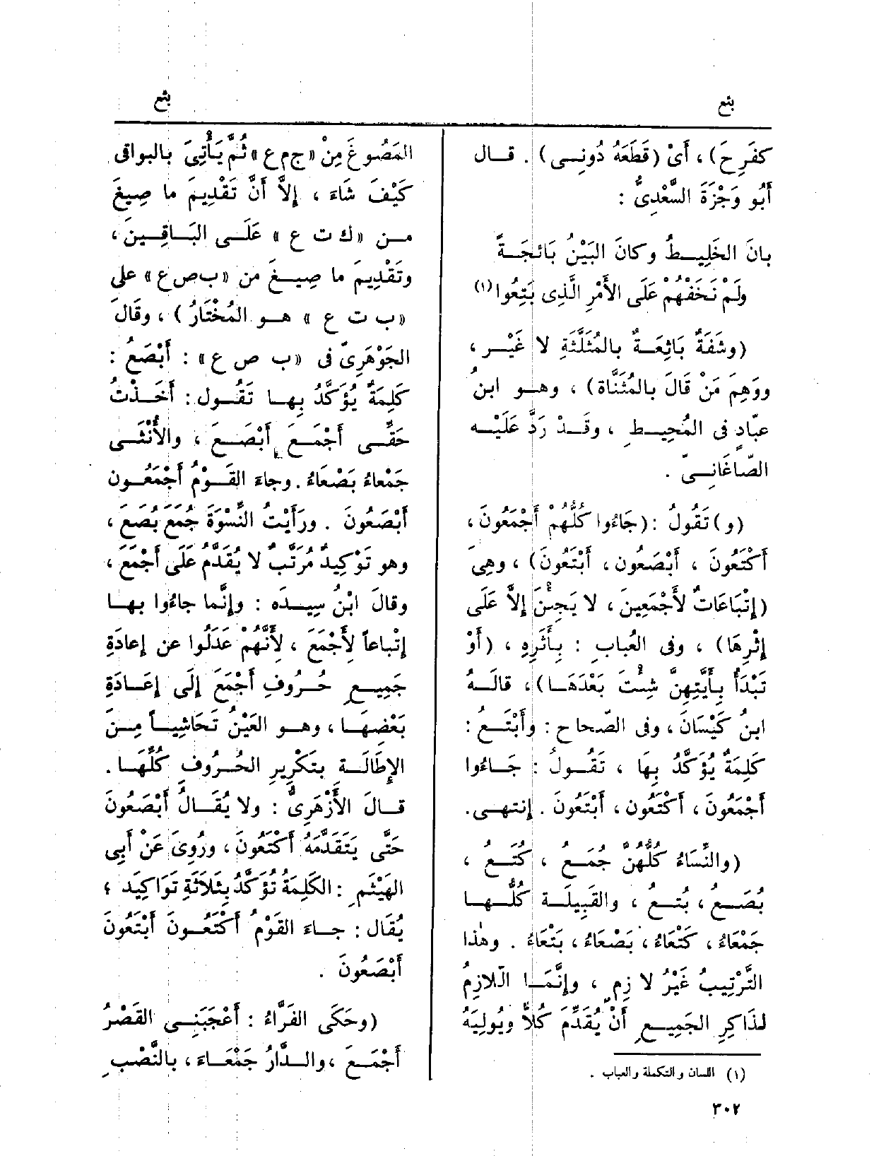 والنِّسَاءُ كُلُّهُنًّ جُمَعُ، كُتَعُ، بُصَعُ، بُتعُ، والقَبِيلَة كُلُّها جَمْعَاءُ، كَتْعَاءُ، بَصْعَاءُ، بَتْعَاءُ. وَهَذَا التَّرْتِيبُ غَيْرُ لازِمٍ، وإِنَّمَا اللاَّزِمُ لذَاكِرِ الجَمِيعِ أَنْ يُقَدِّمَ كُلاًّ ويُولِيَهُ المَصُوغَ مِنْ ج م ع، ثُمَّ يأْتِيَ بالبواقي كَيْفَ شَاءَ، إِلاَّ أَنَّ تَقْدِيمَ مَا صِيغَ من ك ت ع، عَلَى البَاقِين، وتَقْدِيمَ مَا صِيغَ من ب ص ع على ب ت ع هُوَ المُخْتارُ، وقَالَ الجَوْهَرِيّ فِي ب ص ع: أَبْصَعُ كَلِمَةٌ يُؤَكّدُ بِها تَقُول: أَخَذْتُ حَقِّي أَجْمَعَ أَبْصَع، والأُنْثَى جَمْعاءُ بَصْعَاءُ. وجاءَ القَوْمُ أَجْمَعُون أَبْصَعُونَ. ورَأَيْتُ النِّسْوَةَ جُمَعَ بُصَعَ، وَهُوَ تَوْكِيدٌ مُرَتَّبٌ لَا يُقَدَّمُ عَلَى أَجْمَعَ، وقالَ ابْنُ سِيدَه: وإِنَّما جاءُوا بهَا إِتْباعاً لأَجْمَعَ، لأَنَّهُمْ عَدَلُوا عَن إِعادَةِ جَمِيعِ حُرُوفِ أَجْمَعَ إِلَى إِعَادَةِ بَعْضِهَا، وَهُوَ العَيْنُ تَحَاشِياً مِنَ الإِطَالَةِ بتَكْرِيرِ الحُرُوفِ كُلِّهَا. قالَ الأَزْهَرِيُّ: وَلَا يُقَالُ أَبْصَعُونَ حَتَّى يَتَقَدَّمَهُ أَكْتَعُونَ، ورُوِيَ عَنْ أَبِي الهَيْثَمِ: الكَلِمَةُ تُؤَكَّدُ بِثَلاَثَةِ تَوَاكِيدَ، يُقَال: جاءَ القَوْمُ أَكْتَعُونَ أَبْتَعُونَ أَبْصَعُونَ.)