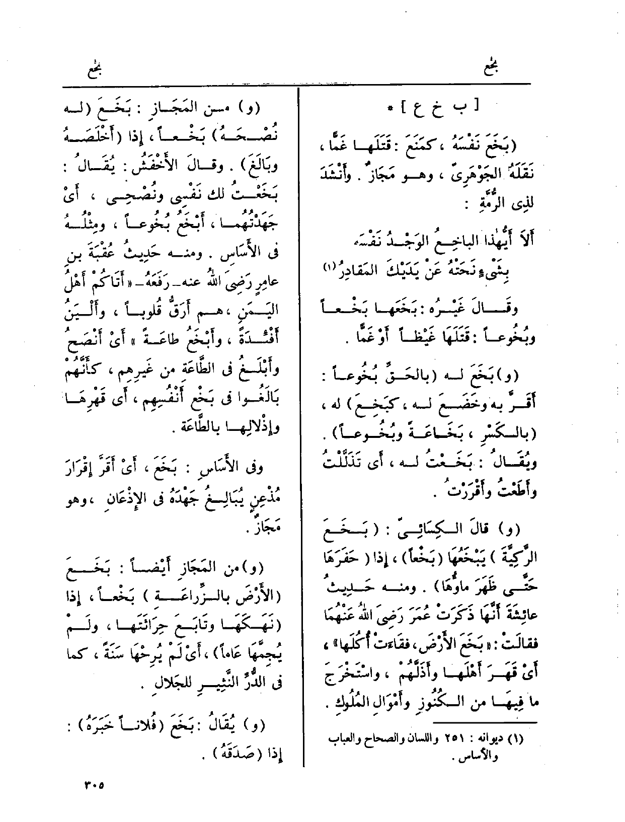 بَخَعَ نَفْسَهُ، كمَنَعَ: قَتَلَها غَمَّاً، نَقَلَهُ الجَوْهَرِيّ، وَهُوَ مَجَازٌ. وأَنْشَدَ لذِي الرُّمَّةِ: