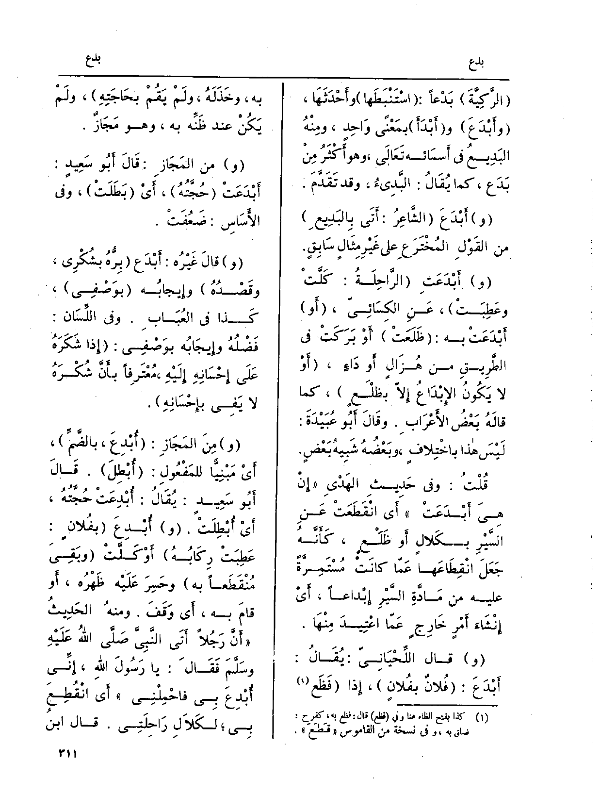 وأَبْدَعَتِ الرَّاحِلَةُ: كَلَّتْ وعَطِبَتْ، عَنِ الكِسَائِيّ، أَو أَبْدَعَتْ بِهِ: ظَلَعَتْ أَوْ بَرَكَتْ فِي الطَّرِيقِ من هُزَالٍ أَو دَاءٍ، أَوْ لَا يَكُونُ الإِبْدَاعُ إِلاّ بظلْعٍ، كَمَا قالَهُ بَعْضُ الأَعْرَابِ. وقَالَ أَبُو عُبَيْدَةَ: لَيْسَ هَذَا باخْتِلافٍ، وبَعْضُهُ شَبِيهُ بَعْضٍ. قُلْتُ: وَفِي حَدِيثِ الهَدْيِ إِنْ هِيَ أَبْدَعَتْ أَي انْقَطَعَتْ عَنِ السَّيْرِ بكَلالٍ أَو ظَلَعٍ، كَأَنَّهُ جَعَلَ انْقِطَاعَها عَمّا كانَتْ مُسْتَمِرَّةً عَلَيْهِ من مَادَّةِ السَّيْرِ إِبْداعاً، أَيْ إِنْشَاءَ أَمْرٍ خَارِجٍ عَمّا اعْتِيدَ مِنْهَا.