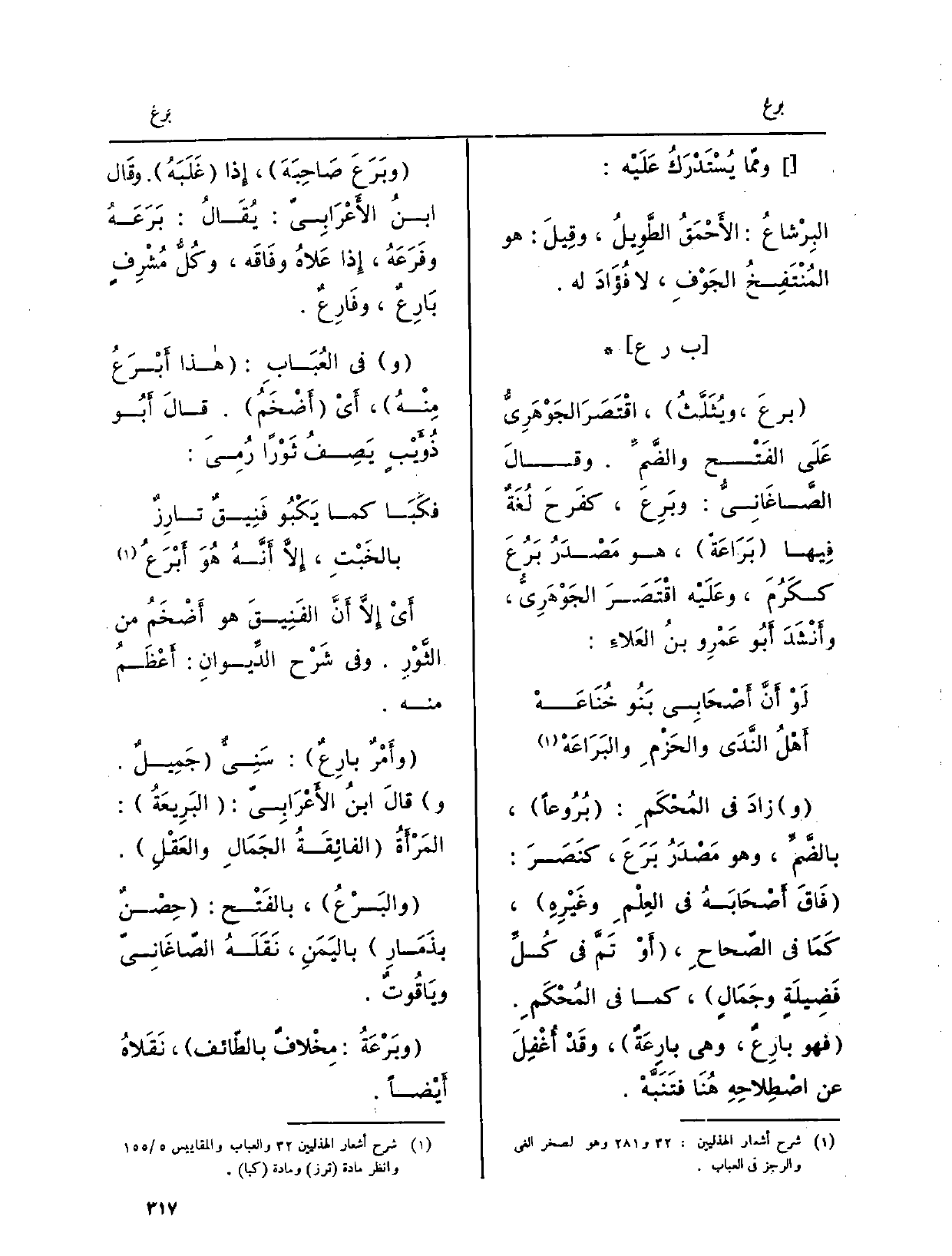 وزادَ فِي المُحْكَمِ: بُرُوعاً، بالضَّمِّ، وَهُوَ مَصْدَرُ بَرَعَ، كنَصَرَ: فَاقَ أَصْحَابَهُ فِي العِلْمِ وغَيْرِهِ، كَمَا فِي الصّحاحِ، أَوْ تَمَّ فِي كُلِّ فَضِيلَةٍ وجَمَالٍ، كَمَا فِي المُحْكَمِ. فَهُوَ بارِعٌ، وَهِي بارِعَةٌ، وقَدْ أُغْفِلَ عَن اصْطِلاحِهِ هُنَا فَتَنَبَّهْ. وبَرَعَ صَاحِبَه، إِذا غَلَبَهُ. وقَال ابنُ الأَعْرَابِيّ: يُقَالُ: بَرَعَهُ وفَرَعَهُ، إِذا عَلاهُ وفَاقَه، وكُلُّ مُشْرِفٍ بَارِعٌ، وفَارِعٌ.